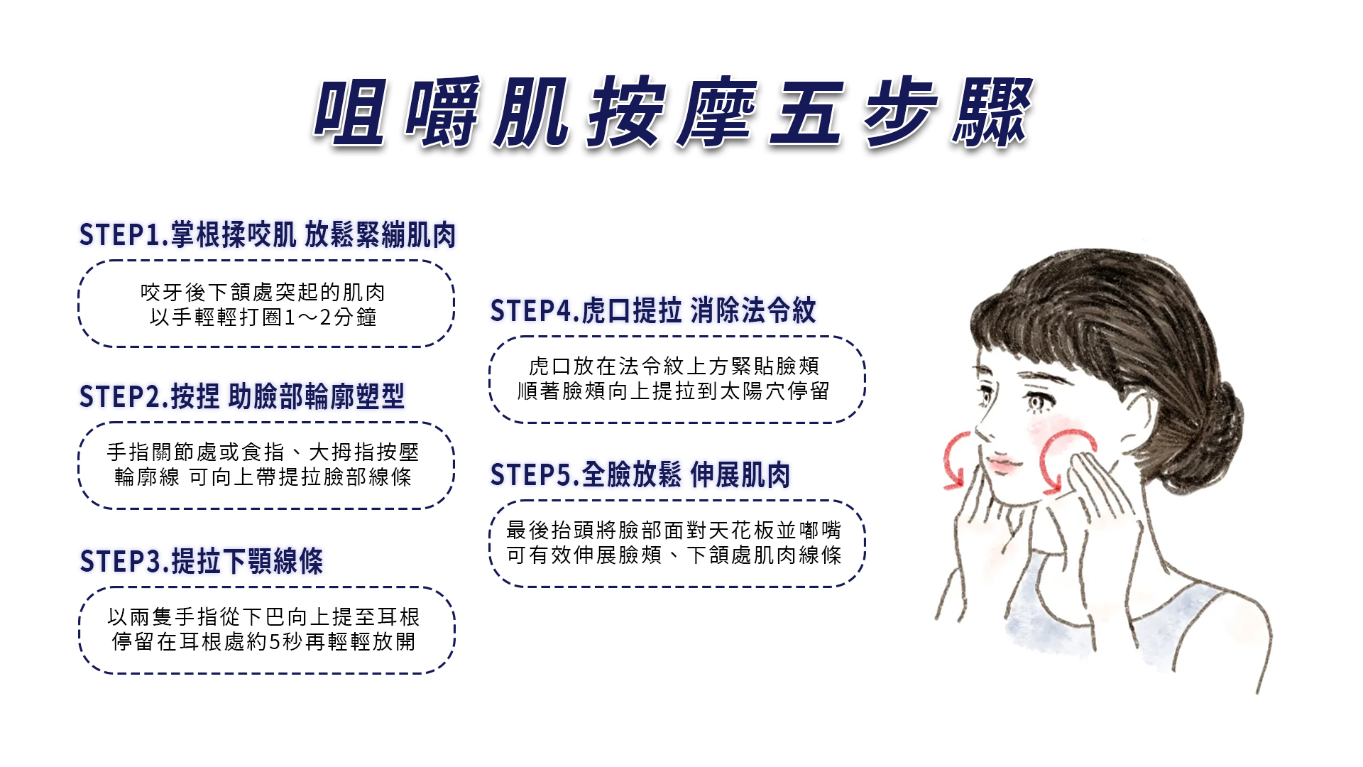 首先找到耳朵下方的咬肌部位(咬緊牙後在下頷處突起的肌肉),盡可能地放鬆咀嚼肌,並使用手心根部,以輕輕打圈的方式按摩1~2分鐘。