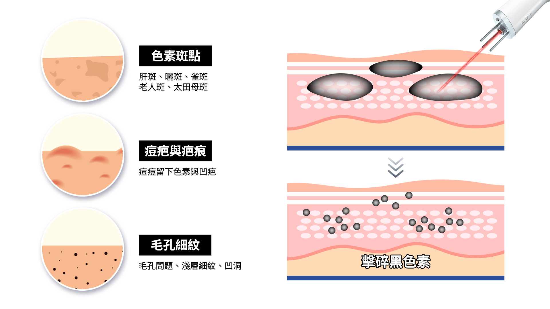 3.有效擊碎深淺色素,改善斑點與刺青
