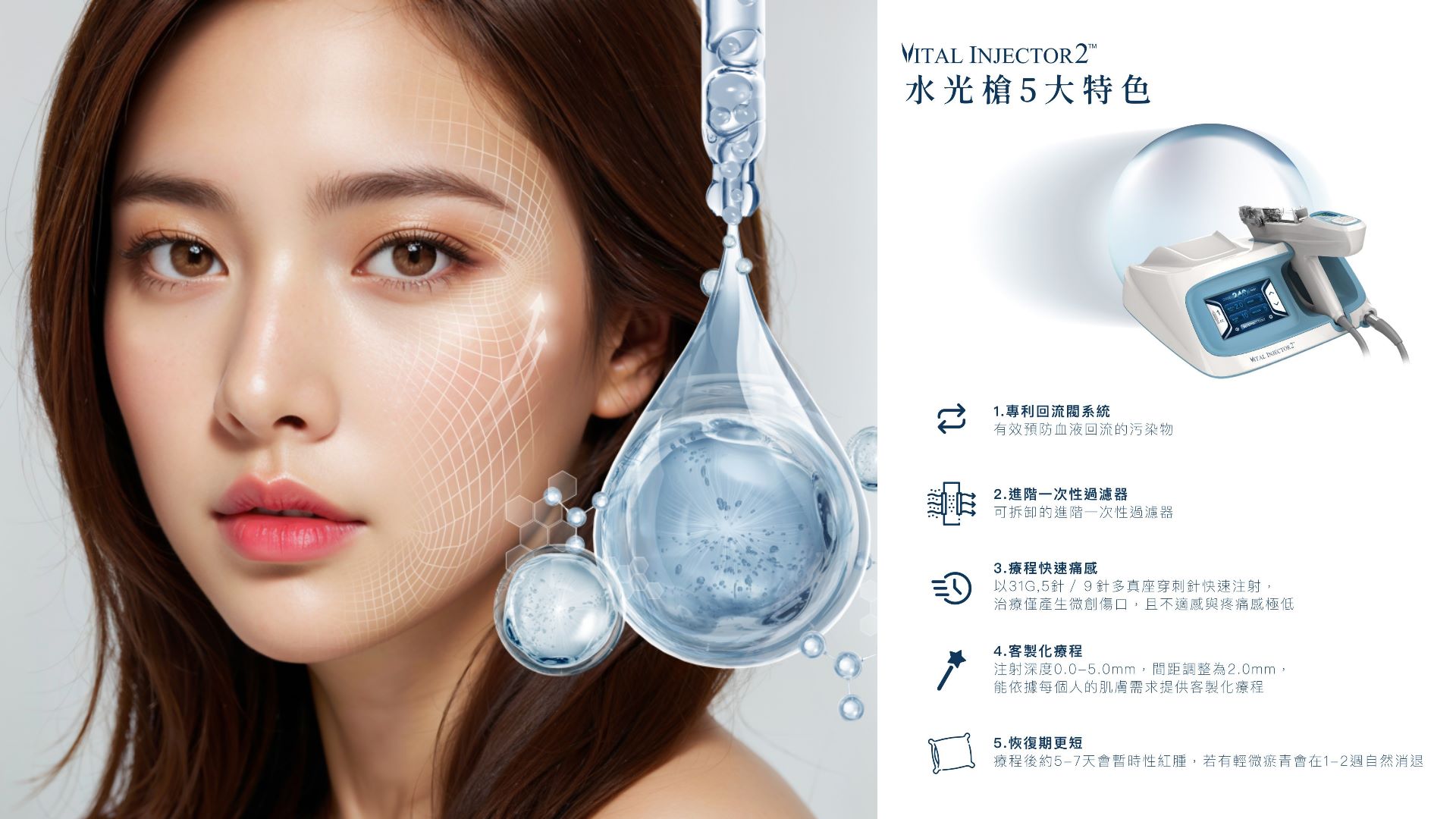 Vital Injector 2 新一代水光注射系統正是因應此需求而發展,透過精準、穩定的注入技術,協助肌膚重建水分儲存、恢復亮澤與飽滿質感。