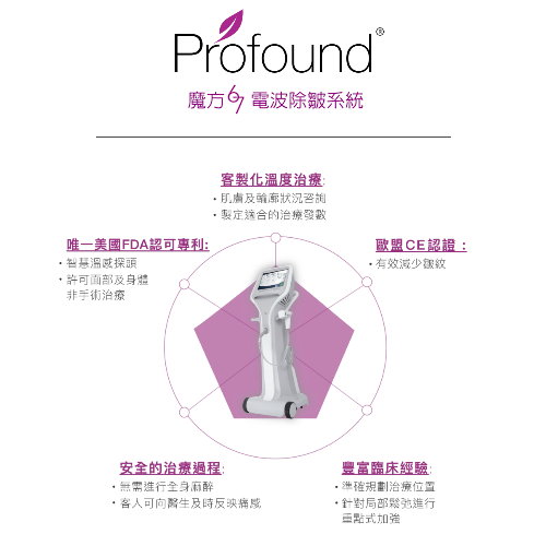Profound魔方電波是一種來自美國的獲得美國FDA、歐盟CE以及台灣衛福部三項認證的注射式雙極電波除皺系統,它結合了侵入式與非侵入式治療方式,利用射頻電流進行微侵入性除皺治療。