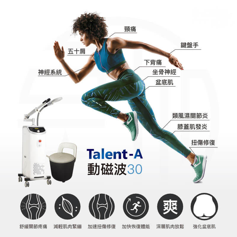 Talent-A 30 是一種創新的高強度聚焦電磁場(HIFEM)技術,能夠透過電磁場誘發肌肉被動收縮,深層刺激肌肉與神經系統,從而達到強化肌肉、舒緩疼痛、增強體態及促進整體健康的效果。