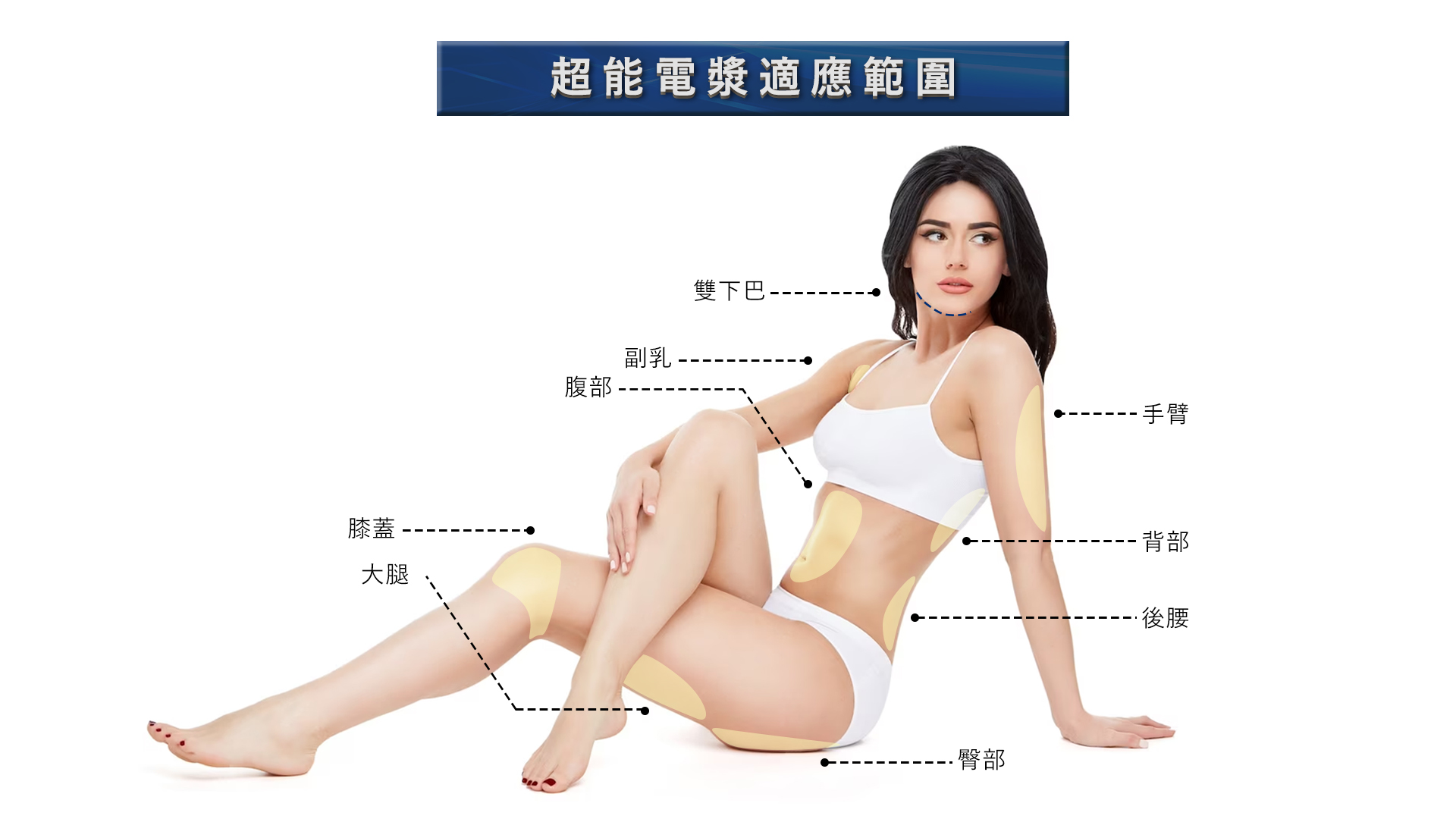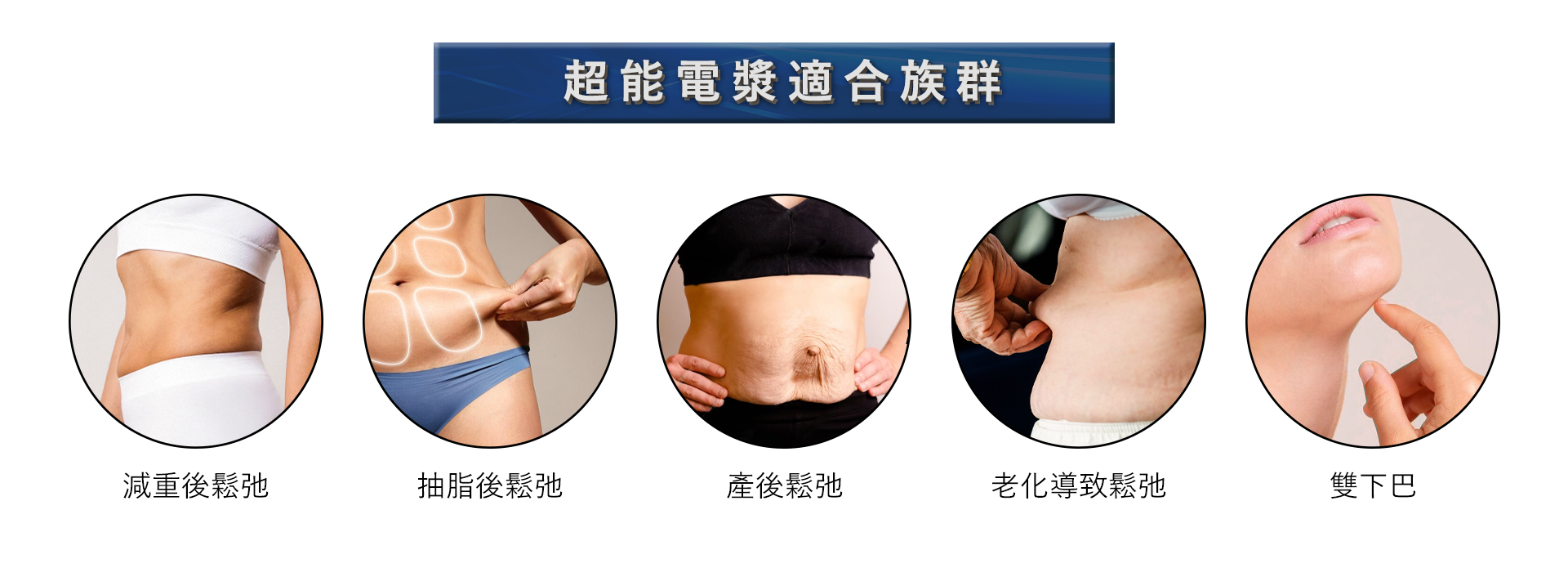 部位:只要是鬆弛的皮膚,全身皆可以做超能電漿來達到緊緻效果,例如:小範圍的臉部、雙下巴、下顎線、頸部線條、副乳、膝蓋、腰窩;大範圍的手臂、背部、後腰、腹部、大腿、臀部、馬鞍…等。