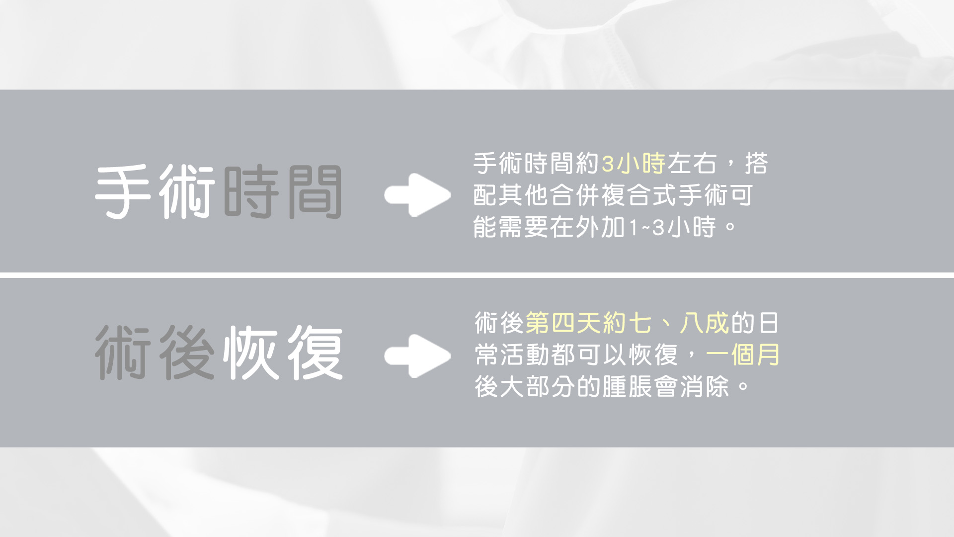 依照手術項目而定,若是單純的隆乳手術,大約3小時左右,若有搭配其他合併複合式手術項目則可能需要在外加1~3小時不等。