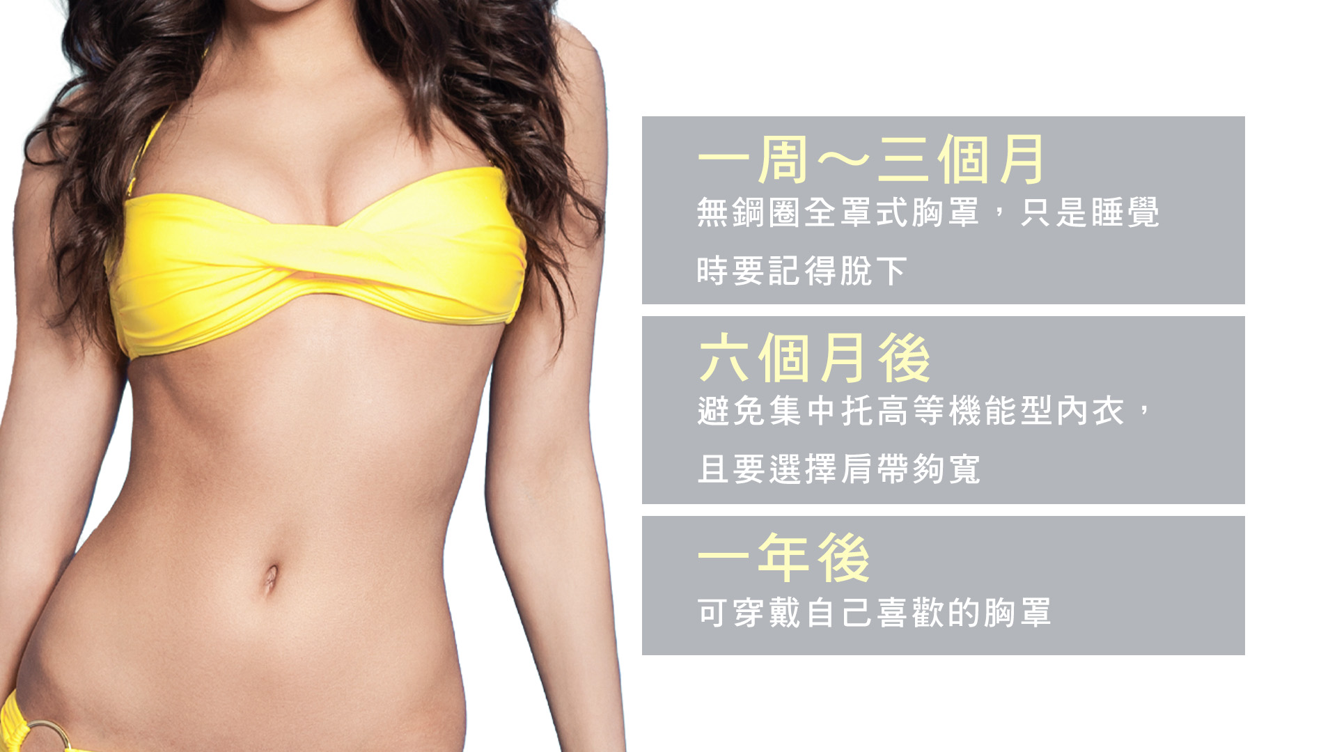 8.正確穿戴胸罩可讓乳房形狀更漂亮,術後一周只可穿戴無鋼圈全罩式的胸罩。術後一周~三個月一樣穿戴無鋼圈全罩式胸罩,只是睡覺時要記得脫下,可讓乳房形狀更快自然。六個月後,即可改穿有鋼絲的內衣了,但請避免有集中托高等機能型內衣,並且要選擇肩帶夠寬有支撐力可撐托胸部的胸罩。術後一年即可穿戴自己喜歡的胸罩了。