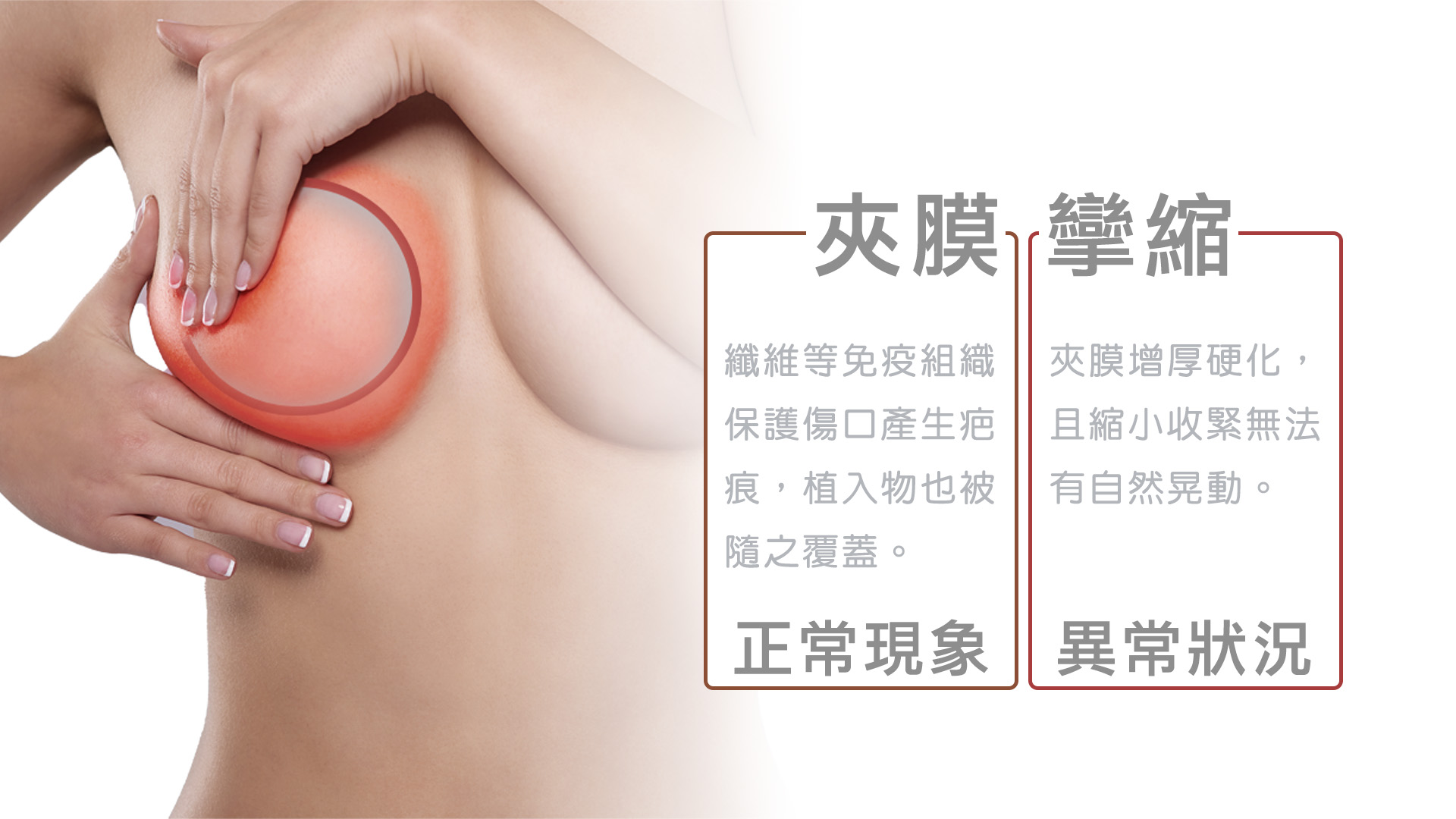 至於顧客最常提到的莢膜攣縮為何,人體本身會有自我防衛與修復機制,會在身上有傷口的部位產生疤痕和纖維等免疫組織進行保護,植入物也會被隨之覆蓋,以免外來物侵害造成身體的危害,因此產生莢膜這樣的纖維包膜組織是正常的。