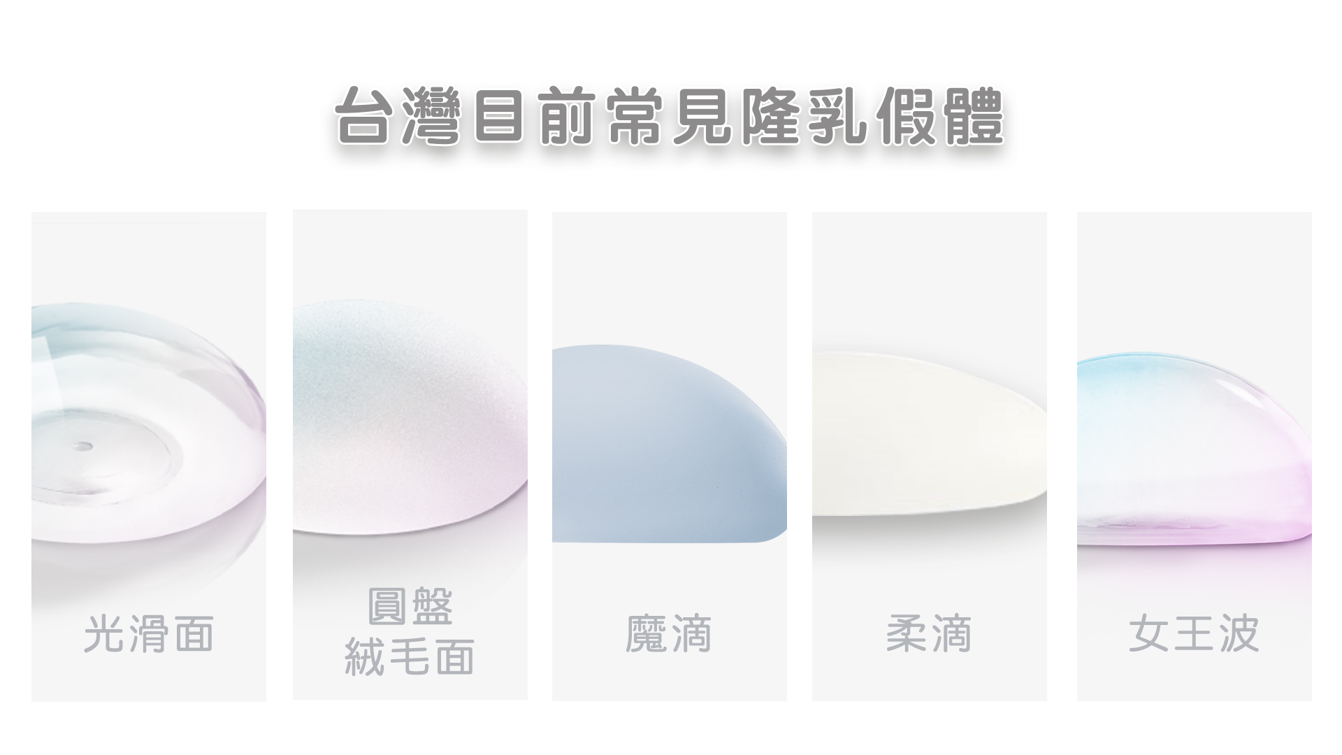 台灣目前市場引進的隆乳假體有以下材質:光滑面、圓盤絨毛面、魔滴、柔滴、女王波。