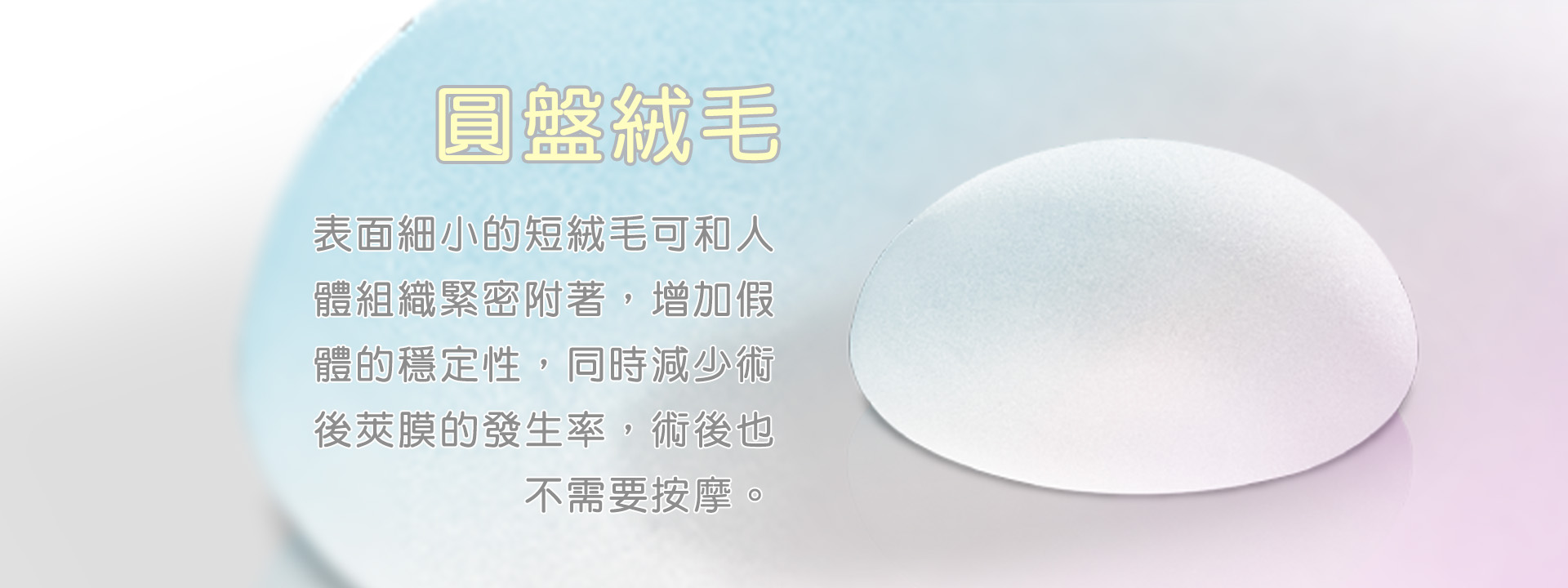 優點: 在表面上會覆蓋著一層細小的短絨毛,植入之後可和人體組織緊密附著,增加假體的穩定性,同時減少術後莢膜的發生率,術後也不需要按摩。