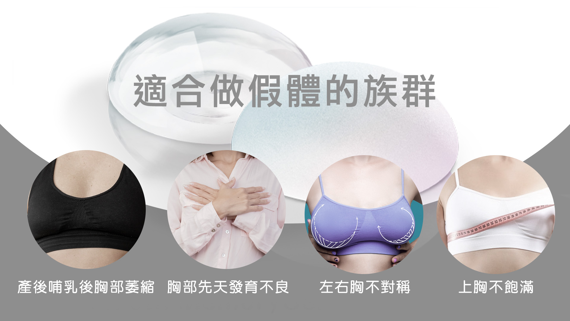 適合族群:本身有點料、皮膚脂肪組織有量、體態較為豐腴者。反之對於皮膚薄、骨感、較瘦的體態、手術位置置入在胸大肌上層者則容易有水波紋及假體邊緣感。