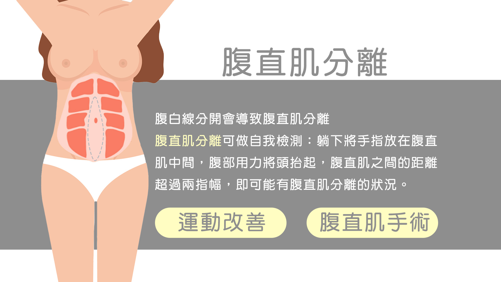 4.腹直肌修復手術: 腹部因懷孕過程將肚皮撐大,同時也將腹直肌撐開分離,若生產後,平常放鬆時目視肚子會凸凸的,若要改善可透過勤勞且有強度的核心運動做訓練,會有機會改善,若是懶得自己運動,可以透過市場上的增肌減脂儀器來做輔助。若想快速達到改善,可以做腹直肌修復手術,回到平坦的腹部,改善肚子凸凸的問題。*腹直肌分離可做自我檢測:先躺下來,將手指放在劍凸以下兩側腹直肌中間,腹部用力將頭抬起,同時將手指滑入兩側腹直肌之間,把腹直肌撐開,如果兩邊腹直肌之間的距離超過兩指幅,可能有腹直肌分離的狀況。