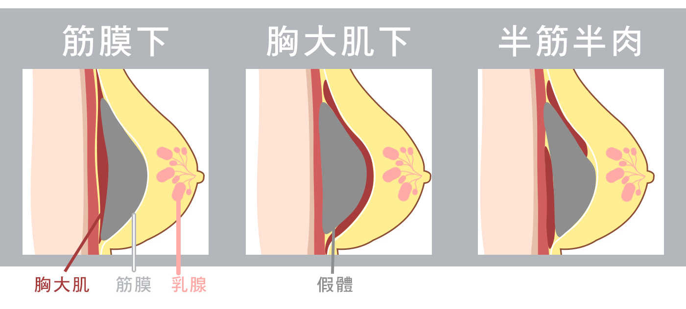 1.胸大肌下:是最深層的位置,所以假體感、水波紋較不明顯,不適感較明顯,若有在重訓者需先告知醫師,因肌肉運動時可能會有跳動情形。適合原先條件料少、皮膚薄、過瘦者。