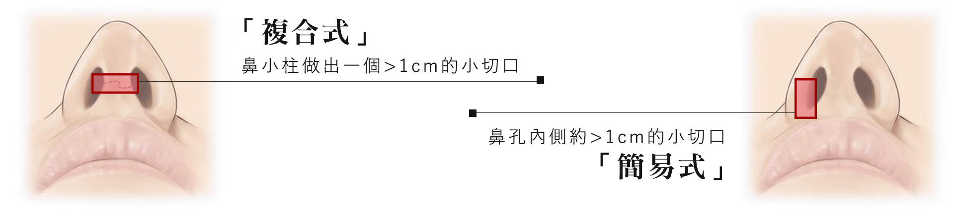 ▋複合式鼻頭塑型手術則除了鼻孔內側切口外,可能會在鼻小柱(columella)做出一個小於0.3cm的小切口,技術熟練的醫師使用最細的縫合線,術後一周雖然看得到縫合小傷口,但拆線後的痕跡幾乎可以看不見。