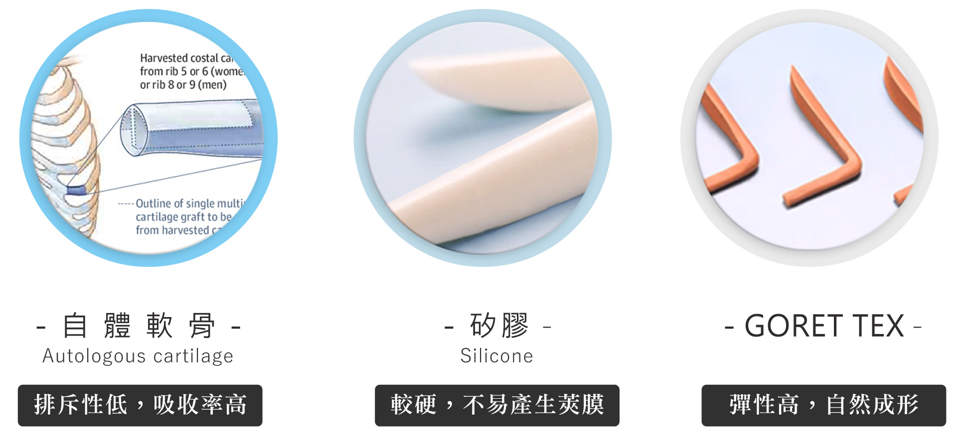鼻頭塑型手術的可選用的材質種類很多,會依照病患本身條件狀況,選擇適當的材質,像是自體鼻中膈軟骨、自體耳軟骨、自體肋軟骨、Silicon、GoreTex、異體肋軟骨、異體真皮…等等。材質的種類各有優缺點,需與專業醫師溝通討論後,選擇最合適自己的材質。