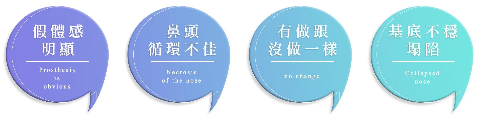放置不合適的植體,如果沒有評估到病患本身的狀況,導致放得太大或支撐力過大,可能造成鼻頭的血液循環不佳,嚴重可能發黑造成鼻頭壞死。