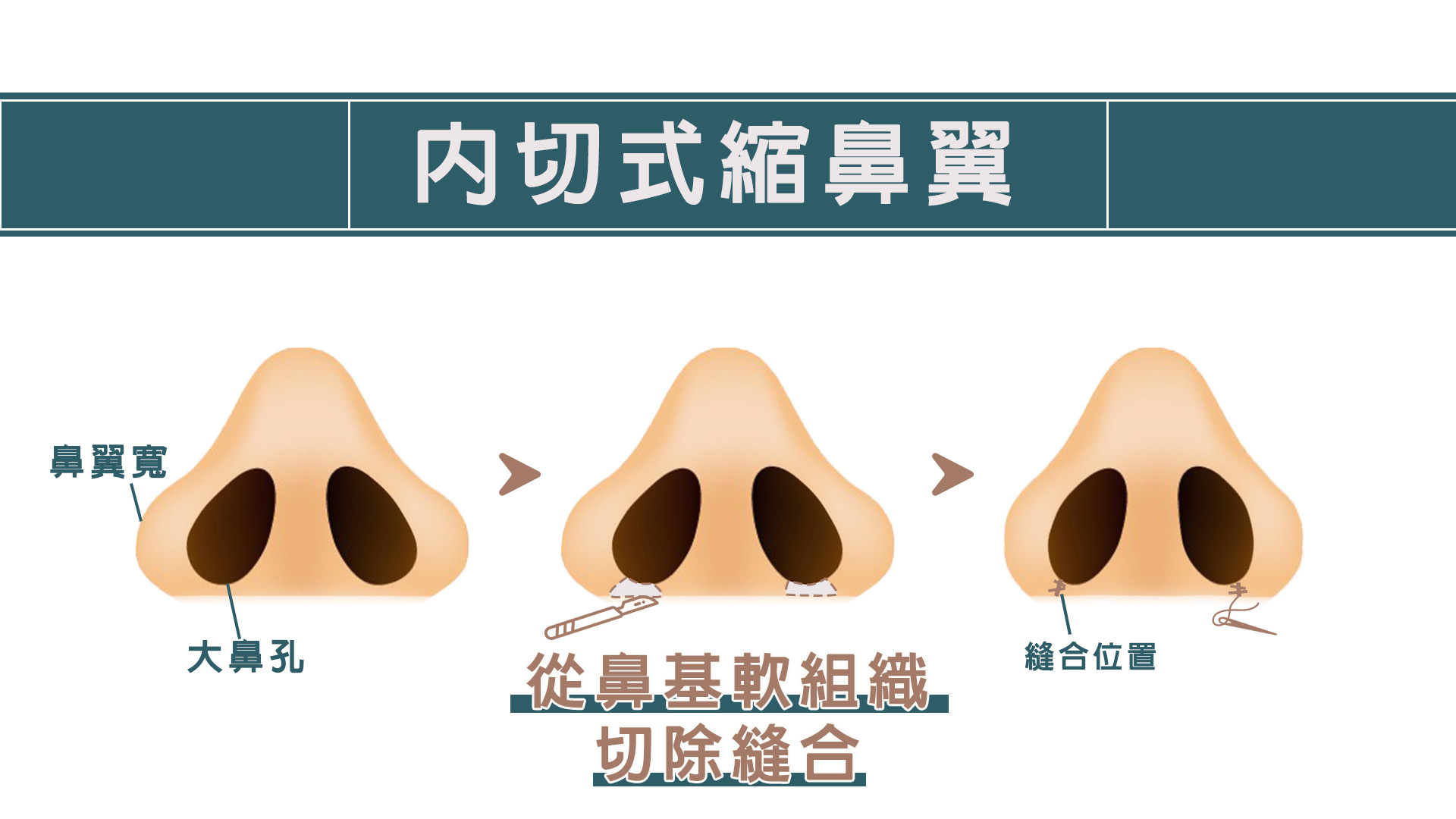 內切式:適合單純鼻翼寬大、鼻孔大者,鼻翼輕微寬大不嚴重者也可以選此做法。將鼻子基部變窄,可以用縫線縮短兩側鼻翼的距離,或是做鼻孔基部的軟組織切除,傷口在鼻孔內側緣,往內固定縫合疤痕較不明顯,但鼻翼縮小程度有限。