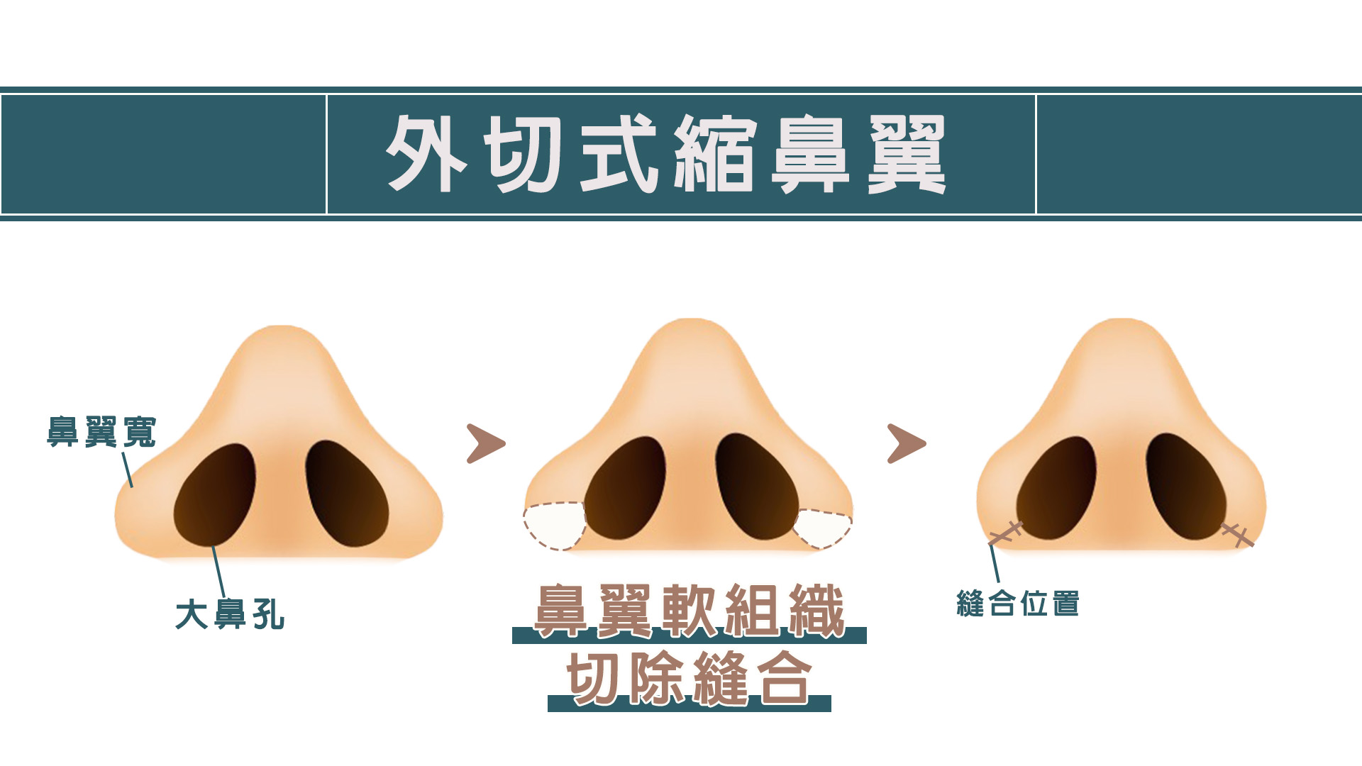 外切式:適合鼻翼肥厚、寬大,想改變鼻孔形狀者,必須切除較多組織的人。切除外擴鼻翼多餘的軟組織,由鼻翼外側或鼻檻切除,疤痕通常在鼻翼及臉頰交接處,疤痕部分可以利用彩妝遮蓋,初期較為明顯,好好照護一段時間,數月後就會慢慢淡化。