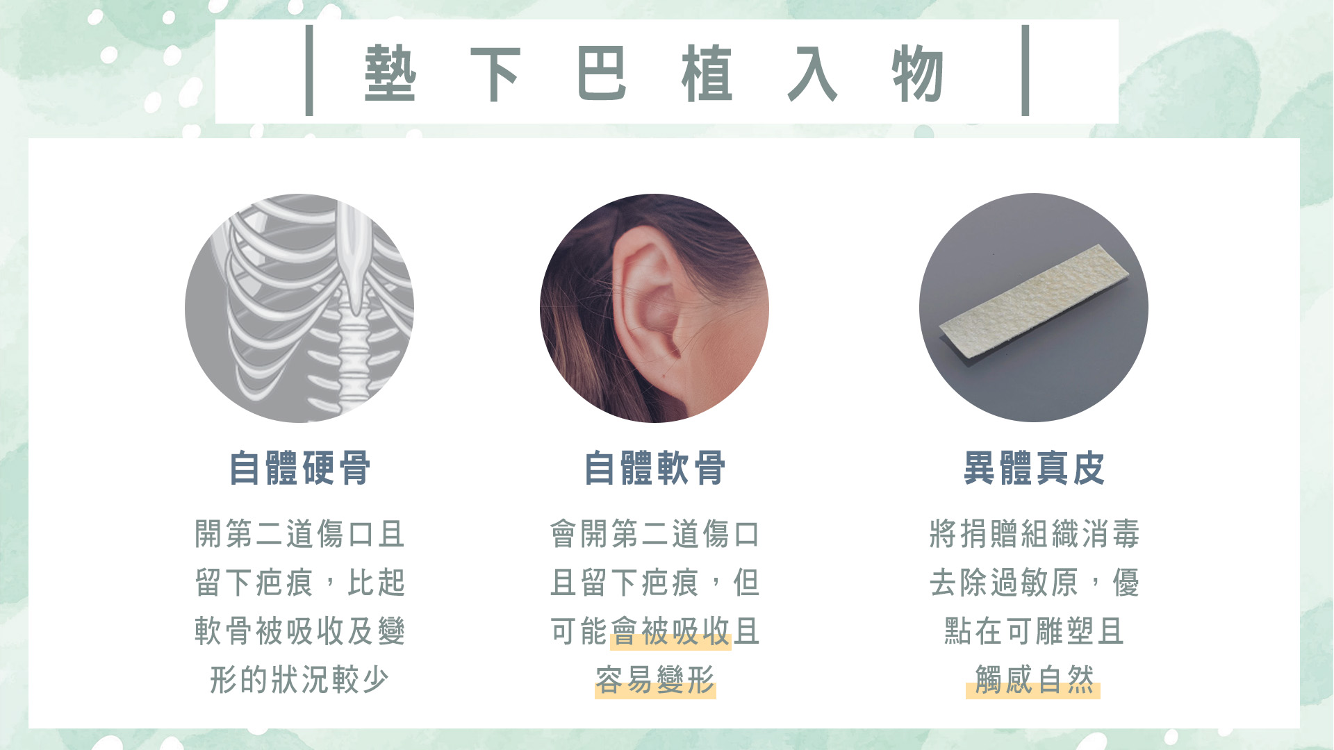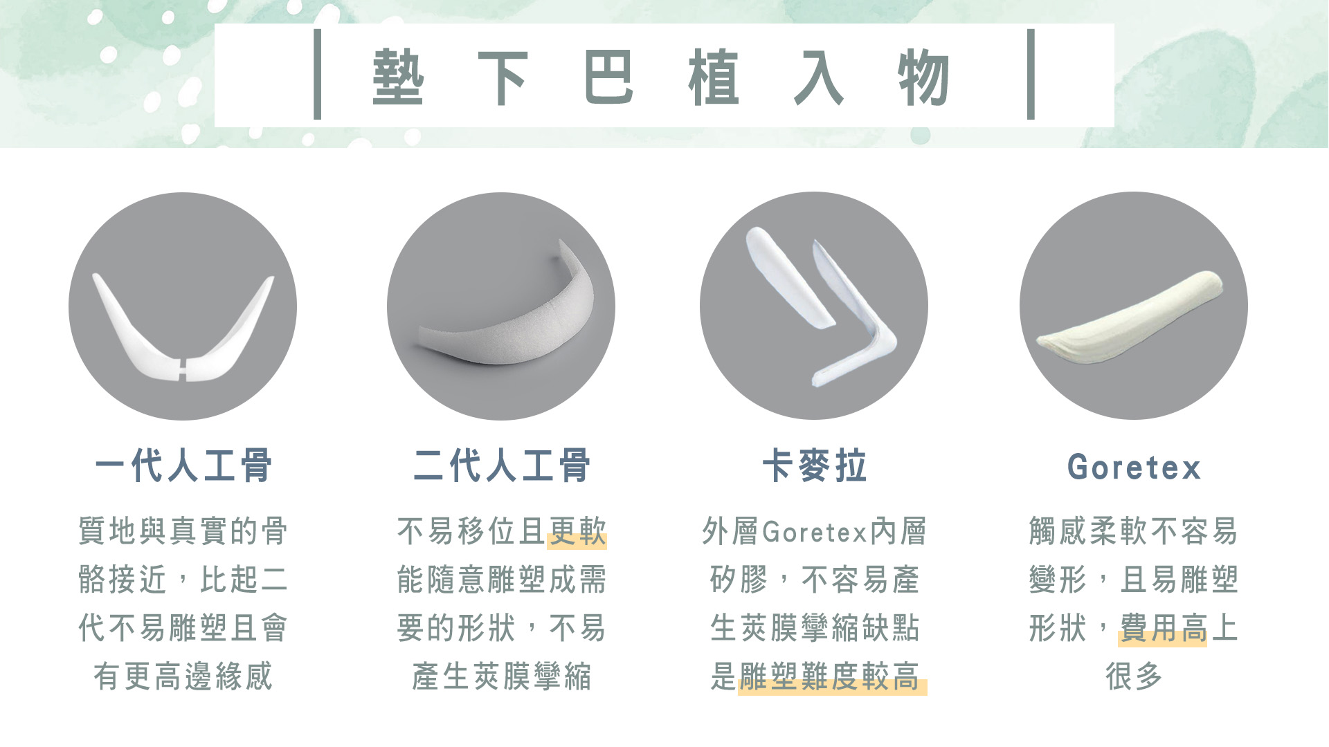 3D列印墊下巴手術會因為選擇的植入物不同會有不同的效果與後遺症,3D列印墊下巴手術會依照每個人的情況,幫客人量身打造專屬的手術方式,與傳統的手術相比更有彈性,傳統的手術方式使用的植入物分為人工與自體兩大類,人工的植入物包含有矽膠、卡麥拉與 Goretex,自體植入物則包含有自體軟骨與硬骨。
