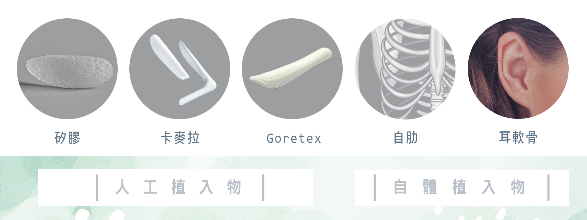 異體組織、真皮、肋軟骨是一種比較新的植體選擇,此方式是利用其他人捐贈的皮膚、筋膜組織、軟骨、硬骨,使用放射線與生物醫學的方式,將捐贈的骨頭、皮膚與組織作一消毒除去掉過敏原,減少組織排斥的狀況,優點在可雕塑且觸感自然,能增加皮膚的飽滿度,且不需要多一道供應處的傷口,但因與組織相容性較佳移除則較為不易。