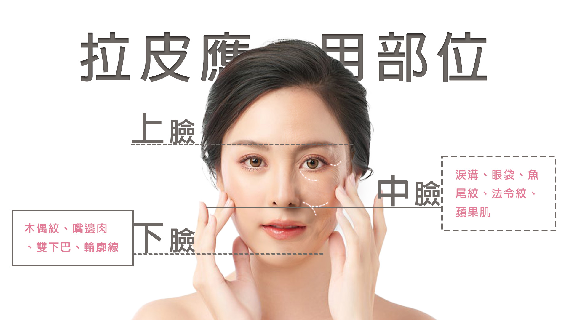 當看著鏡子中的自己,發現皺紋漸顯,肌膚松弛,每個人都想擁有美麗而自信的外表,您是否希望時間能夠悄悄走遠,但卻不留下痕跡?現在這一願望變得更加現實,透過拉皮手術可以很迅速的達到除皺及變年輕的效果,透過不同的拉皮手術並實施在部位,協助皮膚恢復緊實,成為許多輕熟女的最愛。