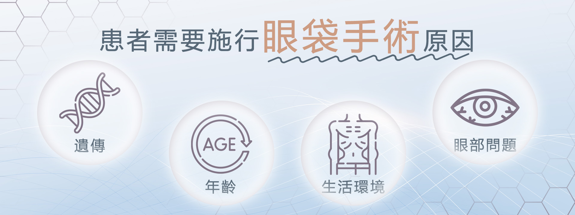年齡因素:隨著年齡漸漸的增長,皮膚和組織的彈性也會跟著降低,脂肪和結締組織也會因為地心引力而下垂,使眼周的脂肪因為失去了彈性而下垂,這些因為與年齡相關產生的眼袋,眼袋手術可以去除多餘的脂肪和組織,重塑眼部輪廓,使眼睛顯得更加年輕有神。