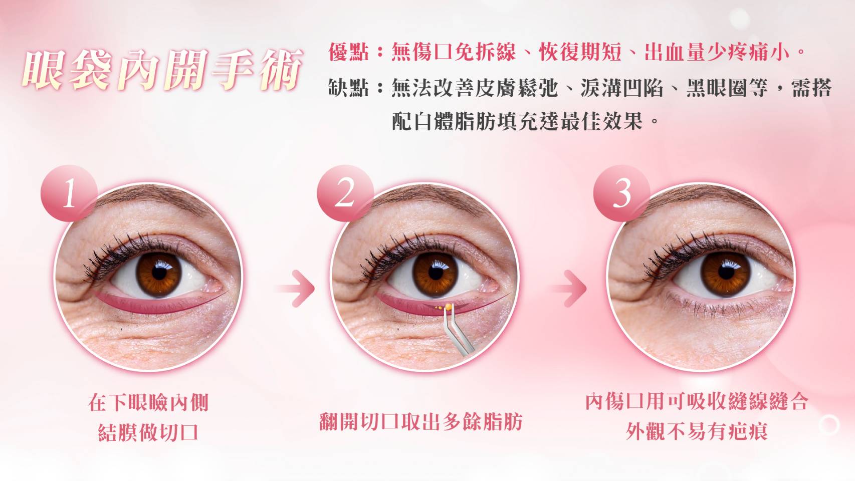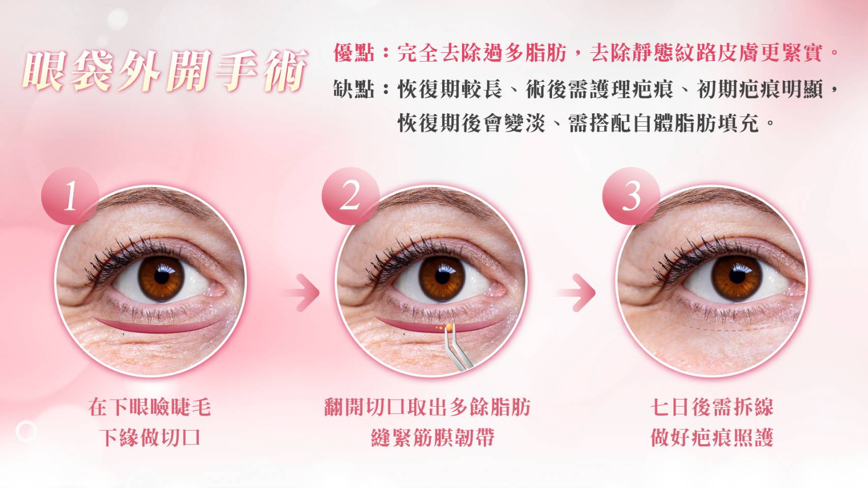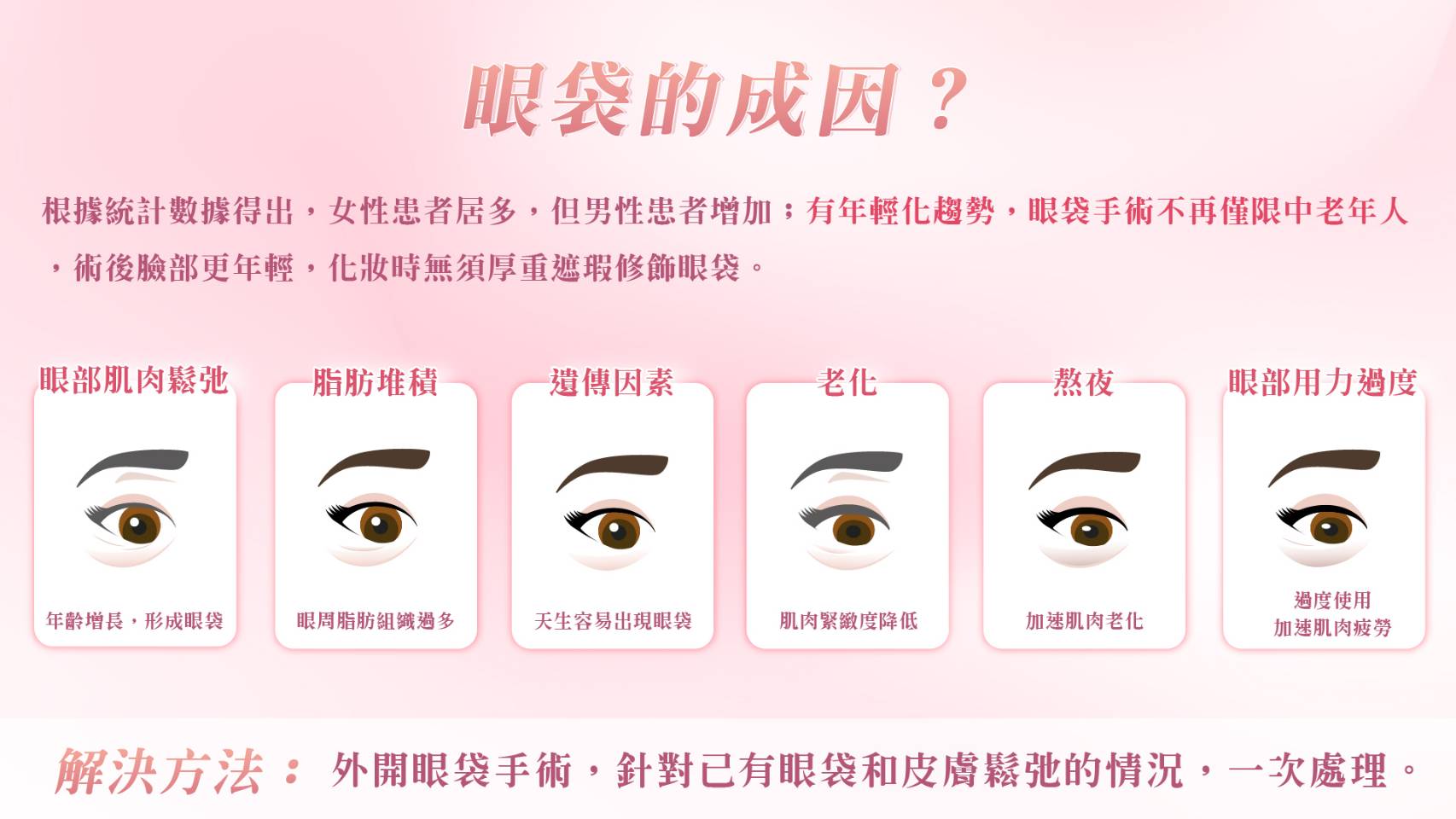 眼袋手術說明 您們知道嗎,眼袋這玩意兒會讓我們的視覺年齡看起來比實際年齡還要老至少五歲呢,整張面容看起來氣色很差、沒精神、憔悴感並且顯老,用化妝品遮瑕也不一定能遮得掉。這時候,高雄眼袋手術會是您一個很好的選擇。 大多數人眼袋、臥蠶、淚溝傻傻分不清楚,這三者雖然是不一樣的部位,但只要有一者狀態不對,都會影響到我們的眼下整體美感並呈現老態。 以下為大家解說細分眼袋、臥蠶、淚溝,可以拿出鏡子邊照鏡子邊參考,一邊認識自己的眼下結構。讓我們對症下藥,精準解決根本問題,打擊老態成為逆齡電眼。 位於下眼睫毛約0.3~0.6公分細長的肌肉(眼輪匝肌)。當表情動作尤其是在笑時更加明顯,就會形成臥蠶。 臥蠶在面相上,因為使人看起來親切可愛,所以帶有好人緣、桃花運強的象徵。 位於眼袋下方眼眶邊緣,可能因先天或後天眼眶隔膜下緣的軟組織萎縮,從內眼角開始往下延伸到下眼瞼靠鼻側形成一條凹陷的韌帶組織溝槽,凹陷處會使黑眼圈更加明顯,而產生疲憊憔悴感,也會凸顯眼袋在視覺上更加明顯。 位於眼睛下方其主要形成的結構為脂肪或結締組織,眼下內筋膜韌帶鬆弛導致支撐力不足,脂肪積聚內部或因鬆弛下垂往前擠壓膨出形成的袋狀結構,所以在外觀看來就會有一包鼓鼓的眼袋在臥蠶下方的眼下位置,眼袋的嚴重程度不同,有些人可能只是輕微的浮腫,而有些人則可能有明顯的凸起。 眼部肌肉鬆弛:隨著年齡的增長,眼部肌肉會逐漸松弛,眼袋就會出現。 脂肪堆積:眼周的脂肪組織如果過多,就會形成眼袋。 遺傳因素:有些人天生就容易出現眼袋,這可能是由於遺傳因素造成的。 老化:隨著年齡的增長,眼周肌肉的緊緻度會逐漸降低,眼袋就會出現。 熬夜:長時間的熬夜會影響睡眠質量,加速眼部肌肉的老化,從而形成眼袋。 眼部用力過度:例如過度閱讀、過度使用電腦等,都會加速眼部肌肉的疲勞,導致眼袋出現 PS.若是已經有眼袋形成,再加上眼下皮膚鬆弛,會有老上加老的冏狀,這時專業醫師會建議採用外開眼袋手術的方式一次處理! 非公開資訊統計數據顯示,台灣到醫美診所做眼袋手術的患者大多為女性,但近年來,男性患者到醫美診所接受眼袋手術的比例有逐漸增加的趨勢,結果顯示,眼袋問題,不再只有女性會在意;統計數據發現,接受眼袋手術的年齡層也有年輕化的情形,眼袋手術不再是只有中老年人的專利,在現今社會當中,眼袋手術也深受年輕族群的喜愛,許多年輕人認為,眼袋手術是CP值相當高的手術項目之一,因為做完眼袋手術後,臉部有年輕化的視覺感,化妝時也可以不用再用厚重的遮瑕修飾眼袋。 以大方向來說眼袋手術可分為眼袋內開手術、眼袋外開手術,兩種手術最大的不同,就是傷口位置。 眼袋內開手術 眼袋內開手術是一種微創手術,會由下眼瞼內側結膜切一個小口,醫師會在手術中避開眼輪匝肌臥蠶,直接切開筋膜將眼袋內多餘的脂肪移除,或視情況做脂肪轉位平均回填,使其平滑消除凸出的外觀,並將眼下鬆弛的筋膜韌帶縫緊固定,再將結膜內傷口用可吸收縫線縫合,就可以改善下眼袋問題。 目前市場上的麻醉方式有局部麻醉及舒眠麻醉,以往都採局部麻醉,患者會感到痛感是在一開始打局部麻醉針劑藥物時,麻醉藥物起作用後便不太會有痛感,但手術過程中會有拉扯感、壓迫感,可能會導致患者手術過程不適、緊張、緊繃,故現在大多院所會提供舒眠麻醉的選擇,消除患者大部分的緊張感,也可以讓整個手術過程既安全又舒適的進行。 術後不用拆線,外觀也幾乎看不出傷口痕跡,不會影響到工作生活作息,是一個可以偷偷進行的無痕手術,適合眼下皮膚彈性好、張力緊實的年輕族群。 優點:無傷口、免拆線、恢復期短,較不會出現眼瞼外翻風險。相比傳統的眼袋切開手術,眼袋內開手術出血量和疼痛較小,因手術切口是在下眼瞼內側進行,所以不會留下任何的疤痕。 缺點:僅可改善單純的眼袋問題,無法改善外部皮膚鬆弛及淚溝凹陷、黑眼圈。如果眼袋皮膚過度鬆弛或是眼袋嚴重皮膚較無彈性的患者,不適用於眼袋內開方式,需要搭配自體脂肪填充達最佳效果。 眼袋外開手術 若因眼下皮膚鬆弛產生明顯無法改善的靜態紋路,皮膚彈性缺乏張力差的族群,可透過眼袋外開做改善。眼袋外開的傷口在皮膚外側,沿著下眼瞼睫毛下方做切口,醫師會在手術中避開眼輪匝肌臥蠶,直接切開筋膜將眼袋內多餘的皮膚和脂肪移除,或視情況做脂肪轉位平均回填,將眼下鬆弛的筋膜韌帶縫緊固定,並將外側多餘的皮膚修剪切除後縫合手術切口,此術式可以切除有靜態紋路的部分皮膚、拉緊眼下肌膚,達到緊緻效果改善眼袋問題。術後約七日須拆線,後續做好疤痕照護,就可以重返年輕。 若因眼下皮膚鬆弛產生明顯無法改善的靜態紋路,皮膚彈性缺乏張力差的族群,可透過眼袋外開做改善。眼袋外開的傷口在皮膚外側,沿著下眼瞼睫毛下方做切口,醫師會在手術中避開眼輪匝肌臥蠶,直接切開筋膜將眼袋內多餘的皮膚和脂肪移除,或視情況做脂肪轉位平均回填,將眼下鬆弛的筋膜韌帶縫緊固定,並將外側多餘的皮膚修剪切除後縫合手術切口,此術式可以切除有靜態紋路的部分皮膚、拉緊眼下肌膚,達到緊緻效果改善眼袋問題。術後約七日須拆線,後續做好疤痕照護,就可以重返年輕。 優點:可完全去除眼袋下過多脂肪和鬆弛皮膚,同時也可提