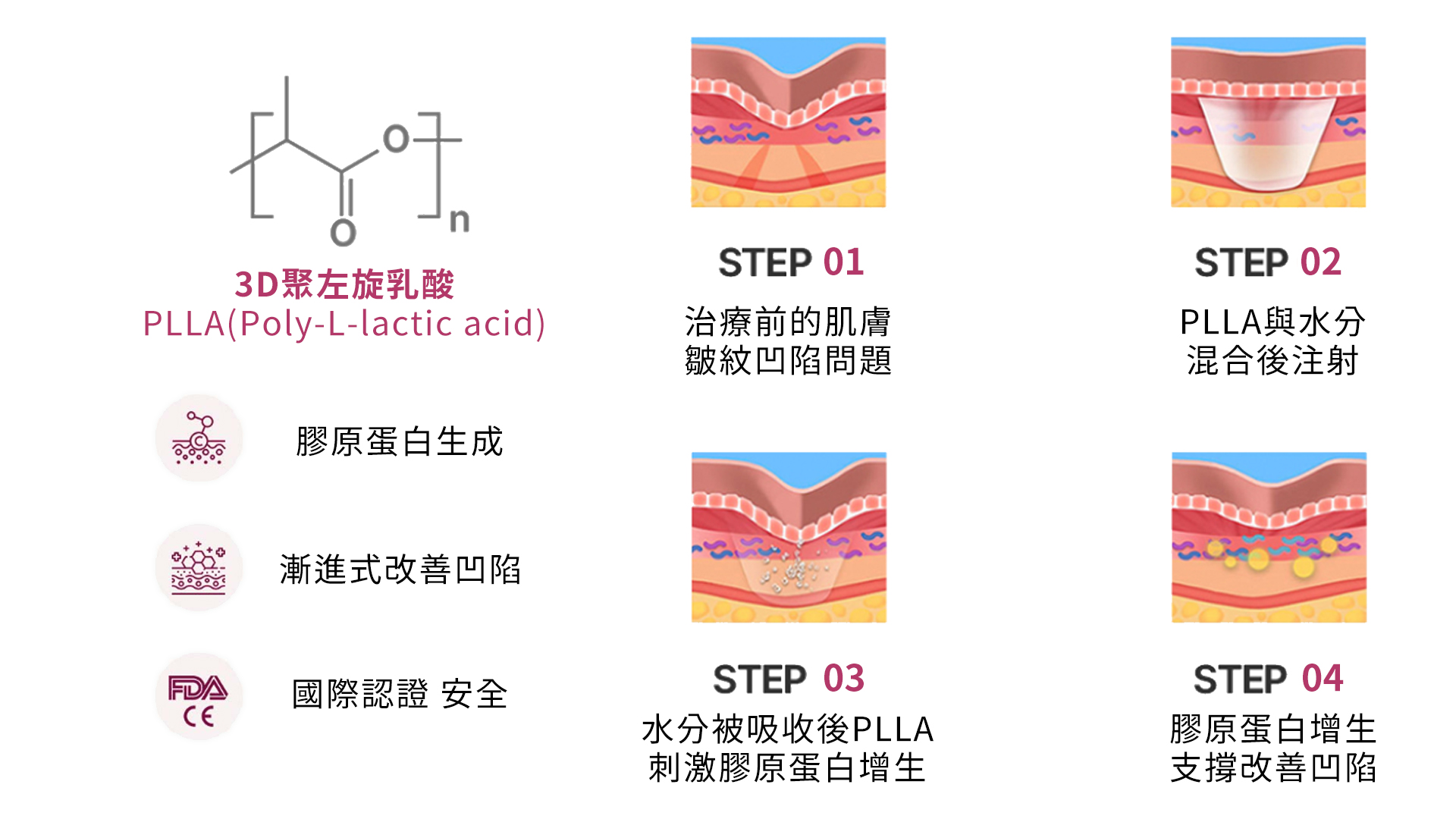 Sculptra®舒顏萃的主要成分為3D聚左旋乳酸(Poly-L-lactic acid / PLLA),屬於一種與生物相容、且能被生物降解 (體內自行分解代謝)的物質,醫學界使用已久,療程前不須另外進行皮膚過敏測試,安全性相當高。