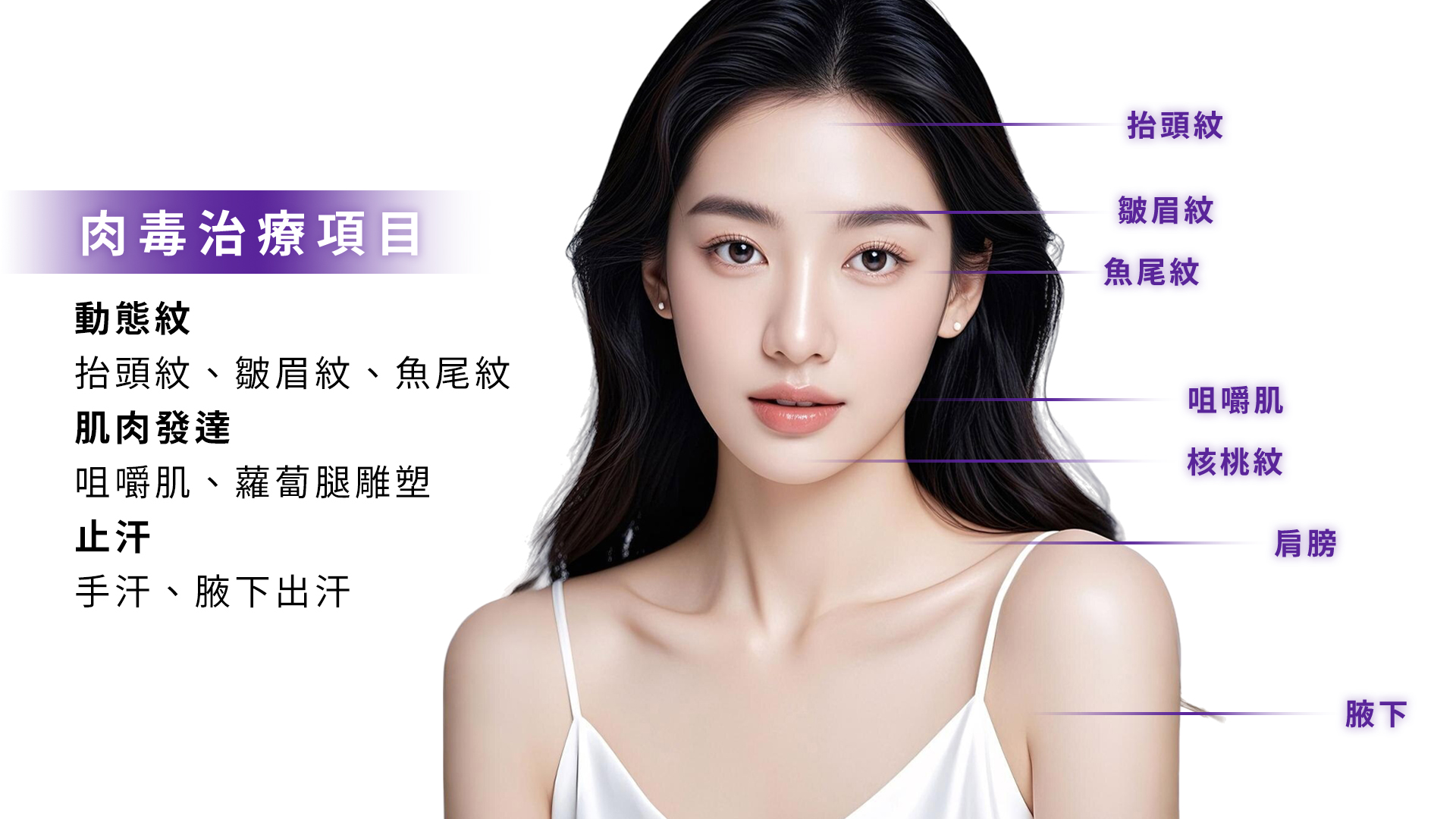 除動態紋(魚尾紋、皺眉紋、抬頭紋、唇紋等)、瘦小臉、瘦小腿、抑制多汗症。