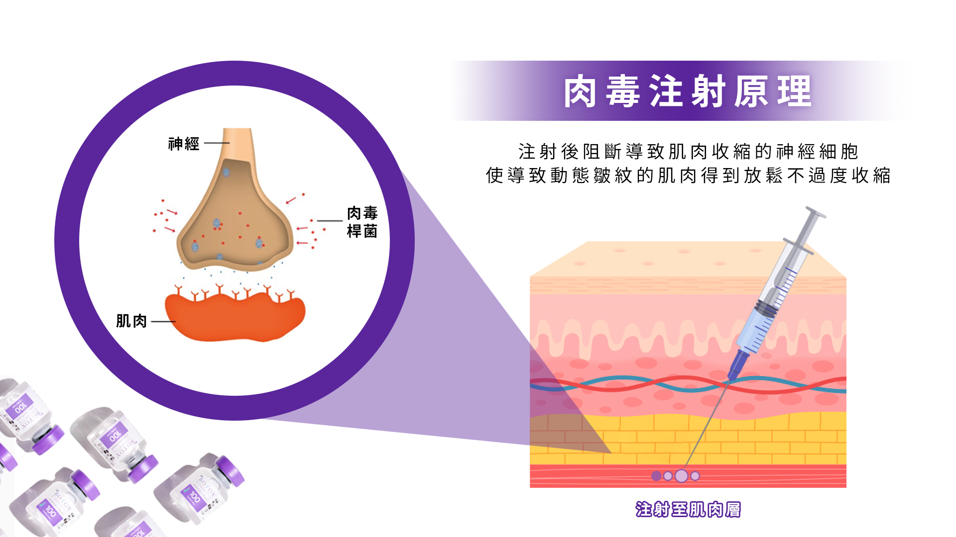 肉毒桿菌素其實是一種神經毒素,在1989年肉毒桿菌毒素(Botulinum toxin A)通過FDA核准,正式成為臨床治療藥物,而目前醫學業界所使用的肉毒桿菌是屬於A型的肉毒桿菌素,此毒素會緊密的依附在人體的神經末稍,可以抑制肌肉收縮元素乙醯膽鹼(Acetyl choline)的正常釋放,可暫時性的使肌肉收縮的力量減弱或麻痺,而達到肌力平衡的目的。肉毒桿菌毒素(botulism toxin)目前分有7種血清型(serotype):A、B、C1、D、E、F、G。各有不同的分子大小、作用位置、方式、時效及穩定性。醫療等級的肉毒必須是將細菌分泌物高度純化才可用來注射,目前台灣核准的只有A型。肉毒桿菌素的適用範圍如皺眉紋、抬頭紋、魚尾紋、眼下笑紋、兔寶寶紋。