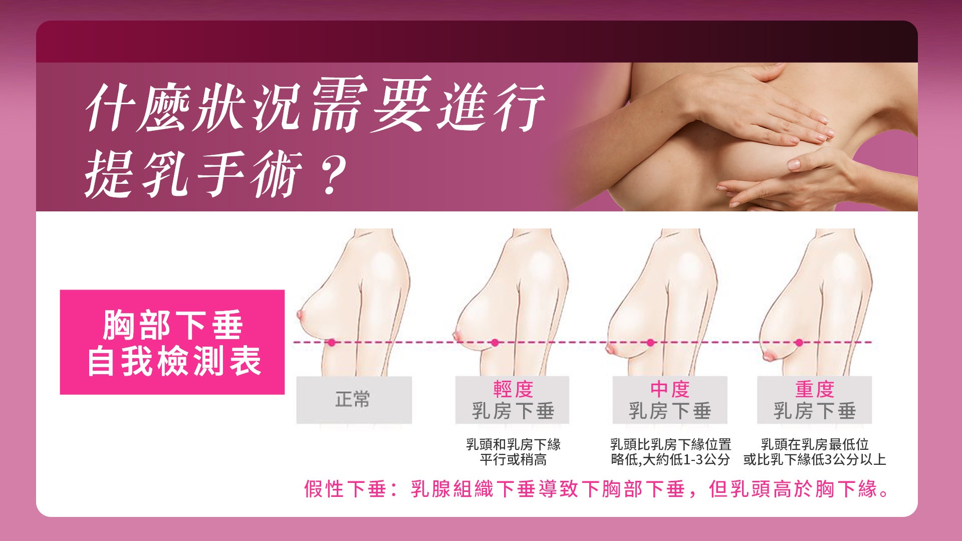 醫學上針對乳房下垂的定義還是乳頭位置,一般來說乳頭位置在胸部圓形的中點,美觀的胸部胸下緣和乳頭的水平位置不能太近,一般來說從側面來看「乳頭水平位置」和「胸下緣水平位置」的「垂直距離」要兩公分以上這樣才叫沒有乳房下垂。