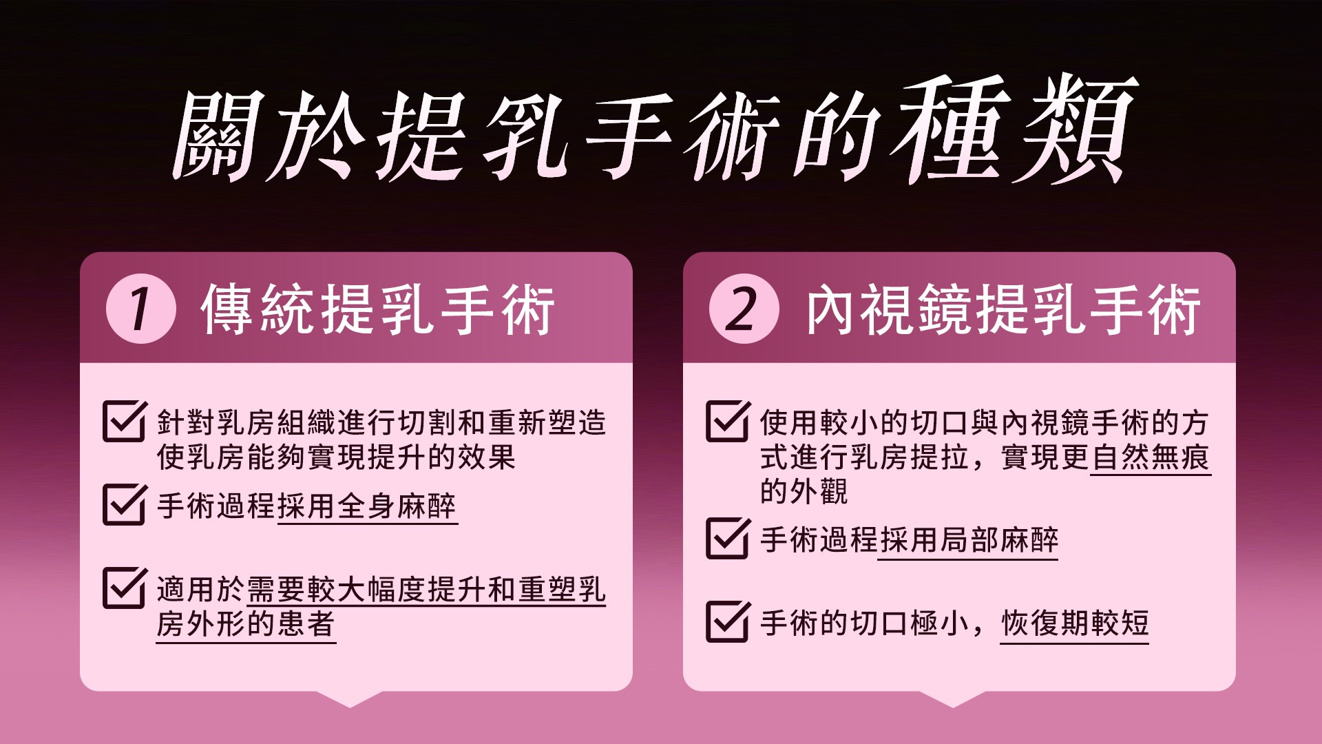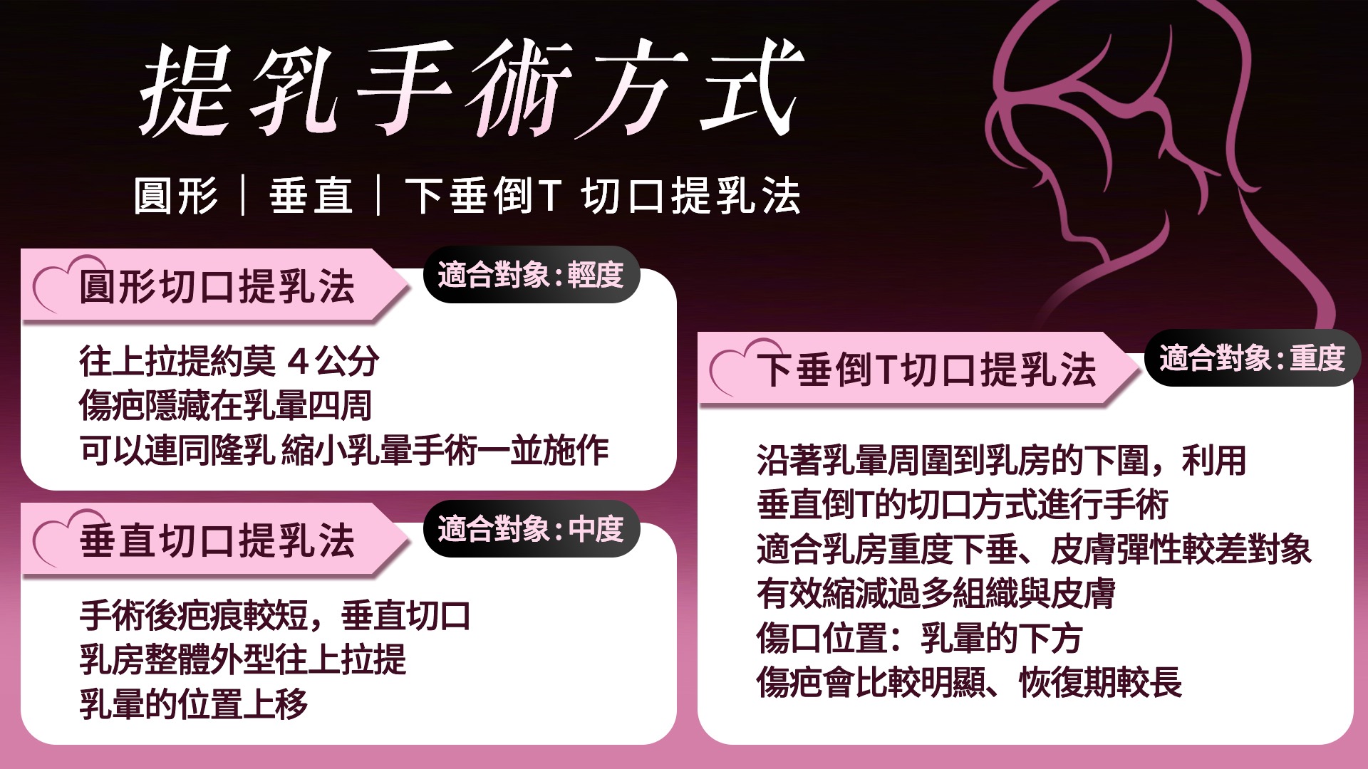 提乳手術的主旨在於用來改善乳房的外觀使其更加挺拔有彈性,同時可提升乳房高度,讓女性擁有更年輕飽滿的雙峰輪廓,提乳手術通常會適用於那些因為懷孕哺乳或因年齡增長、體重波動等因素而導致乳房形狀下垂且失去豐滿雙峰的女性,現代提乳手術的方式分別為圓形切口、垂直切口與下垂倒 T 切口的提乳方式。