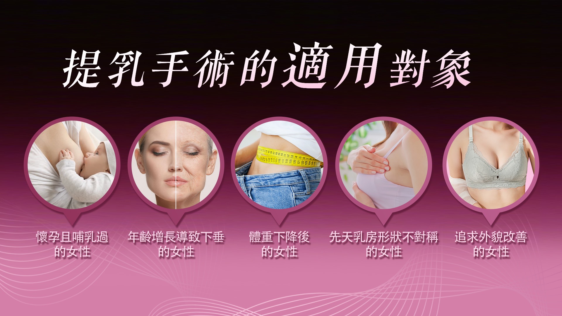 追求外貌改善的女性: 對於希望改善乳房外觀增加自身自信的女性來說,提乳手術是一個不錯的選擇,可能為了尋求更挺拔有吸引力的乳房輪廓,以達到對自身外貌美學的期望。