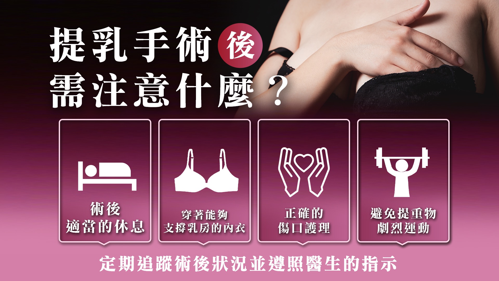 心理支持和自我護理:提乳手術可能會對你的身體和自尊心產生影響,在康復的過程給予自己足夠的心理建設,與親朋好友分享您真實的術後感受並且尋求心理輔導。