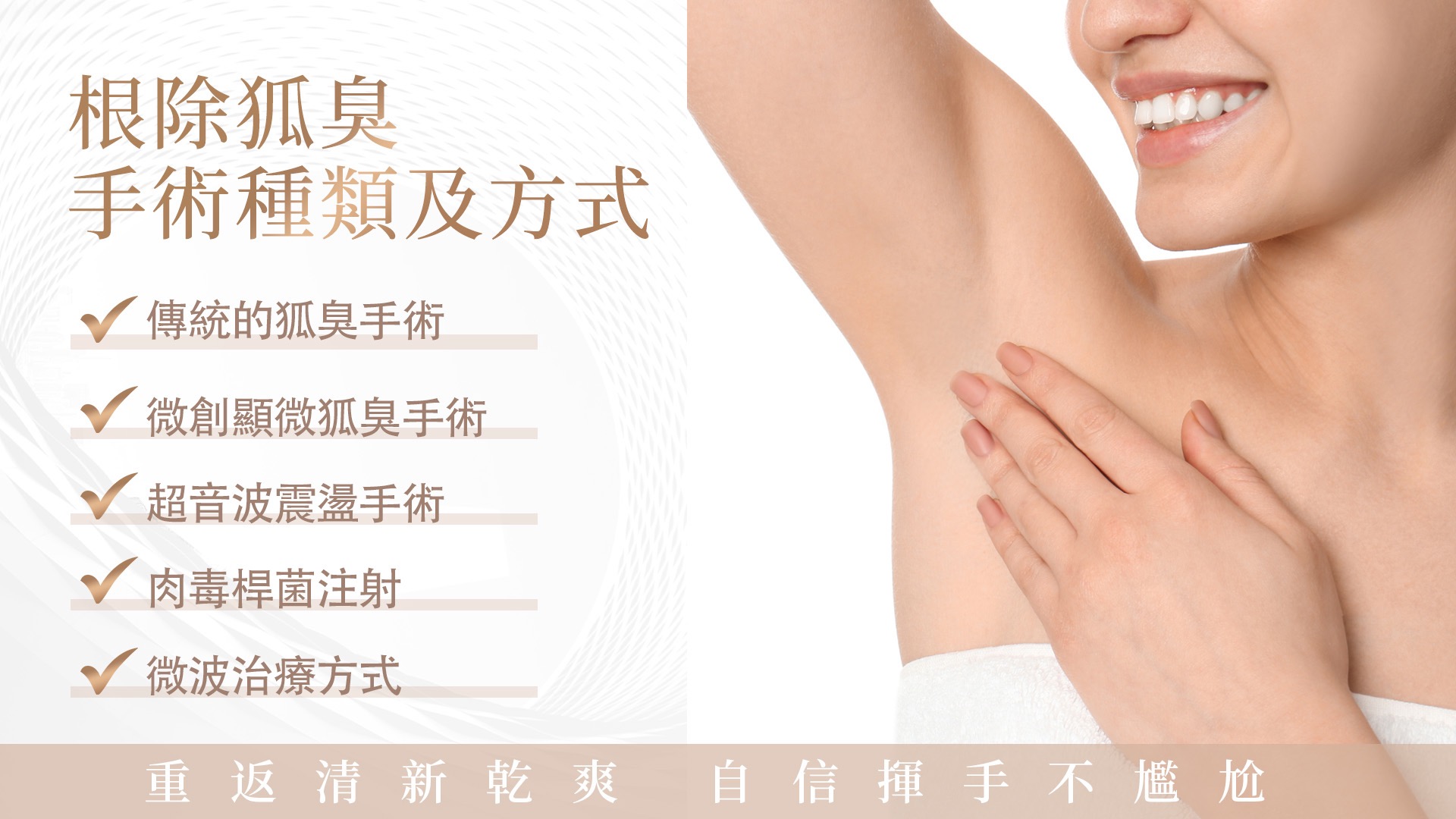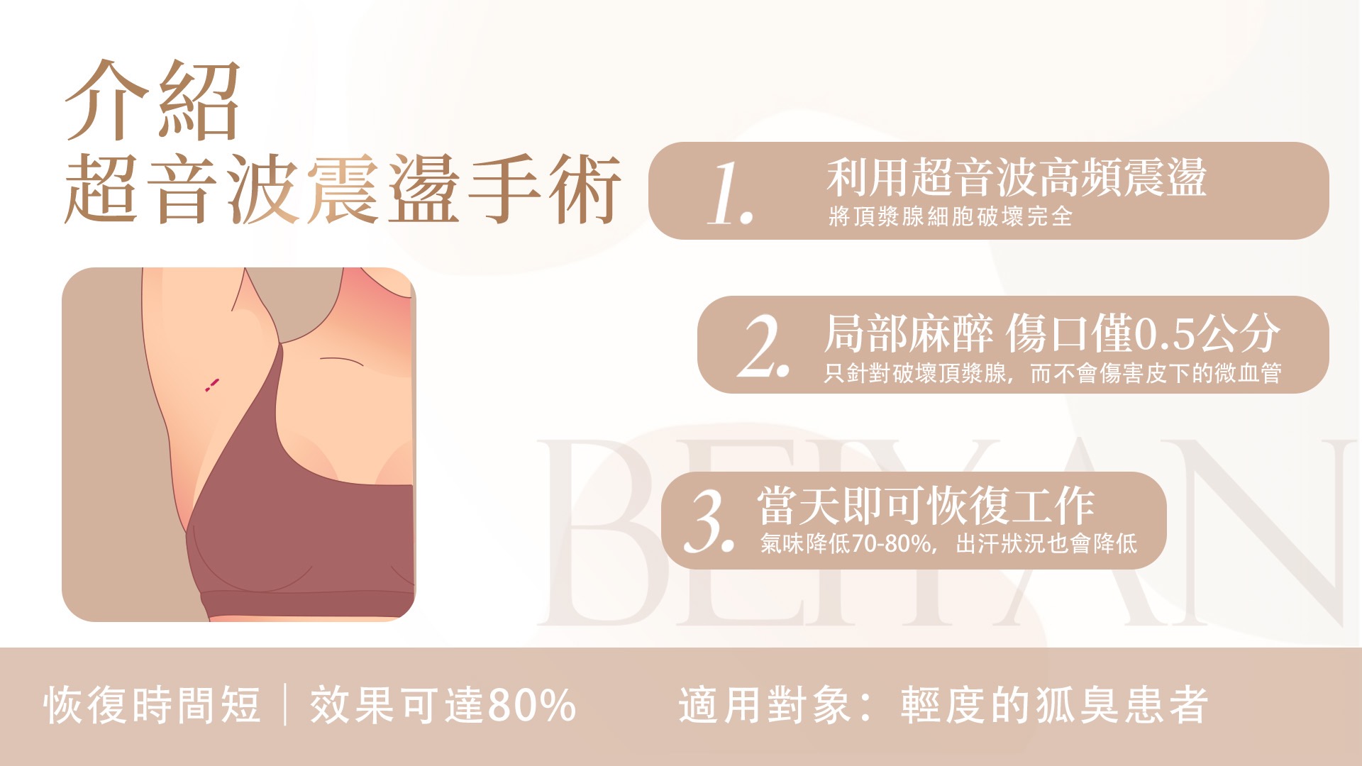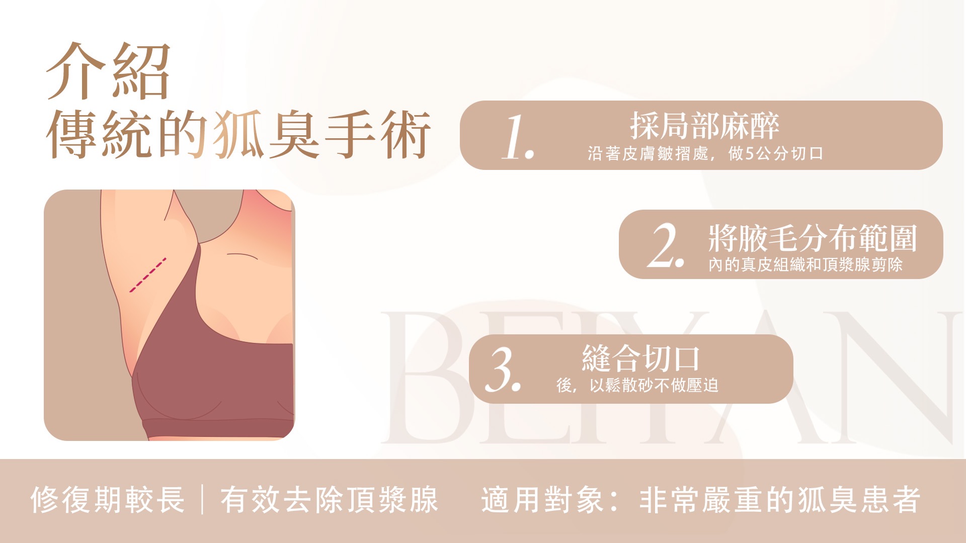 整形外科醫師會替患者局部麻醉並施作狐臭手術,將腋下的頂漿腺剝除掉透過技術的改進及儀器的創新,目前有更多新穎的狐臭手術方式,利用皮下抽脂的手術原理,透過兩萬次的超音波震盪來吸除腋下的頂漿腺,手術的傷口寬度不到一公分,傷口的護理簡單不需要住院,且恢復的時間短,若是患者本身有定期服用阿斯匹靈或有糖尿病與紅斑性狼等會增加傷口癒合難度狀況的病人,進行手術會有較高的併發症發生率,患者術前應與醫師作謹慎的評估討論。