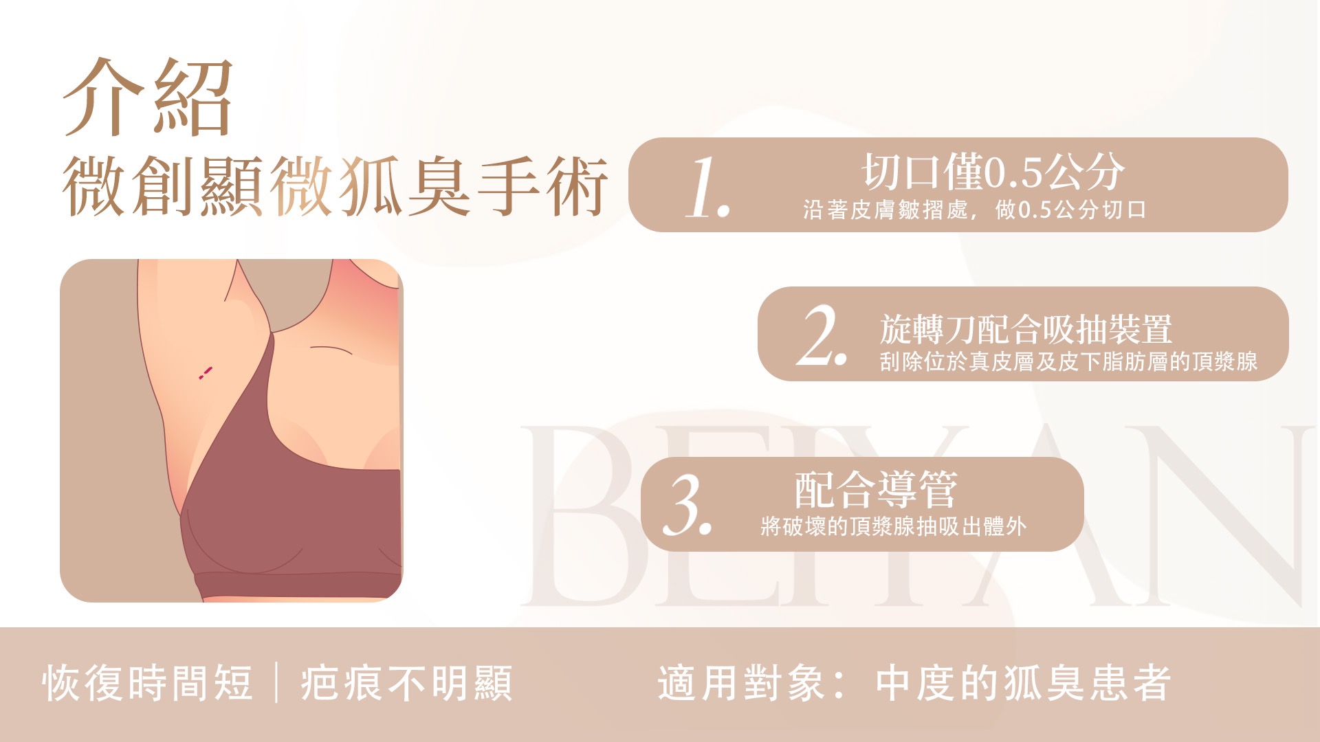 微創顯微狐臭手術是一種微創的狐臭治療手術,也是狐臭治療方式中最需要技術與經驗的。患者在局部麻醉後,手術的過程會先開一道約0.4cm的傷口,執刀醫師會使用狐臭手術使用的旋轉刀,探入傷口裡的小洞配合吸抽裝置,將組織剪放入腋下傷口剝離真皮層,以360度旋轉的方式,刮除位於真皮層及皮下脂肪層的頂漿腺後再吸抽出來,醫師會透過傷口的小洞,反覆檢查頂漿腺是否已完全刮除。