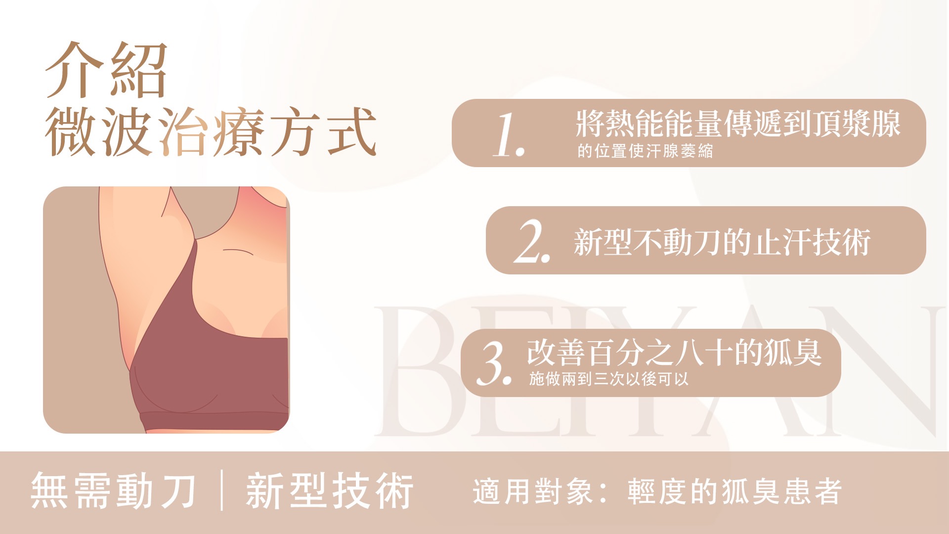 微波的治療方式可以將熱能能量傳遞到頂漿腺的位置使汗腺萎縮,經過治療後也不會產生代償性的排汗,是時下最新型不動刀的止汗技術,施做兩到三次以後可以改善百分之八十的狐臭。因為要把熱能導入皮下脂肪,對皮膚表層有燙傷風險,操作不當可能會有大面積的焦黑燙傷。