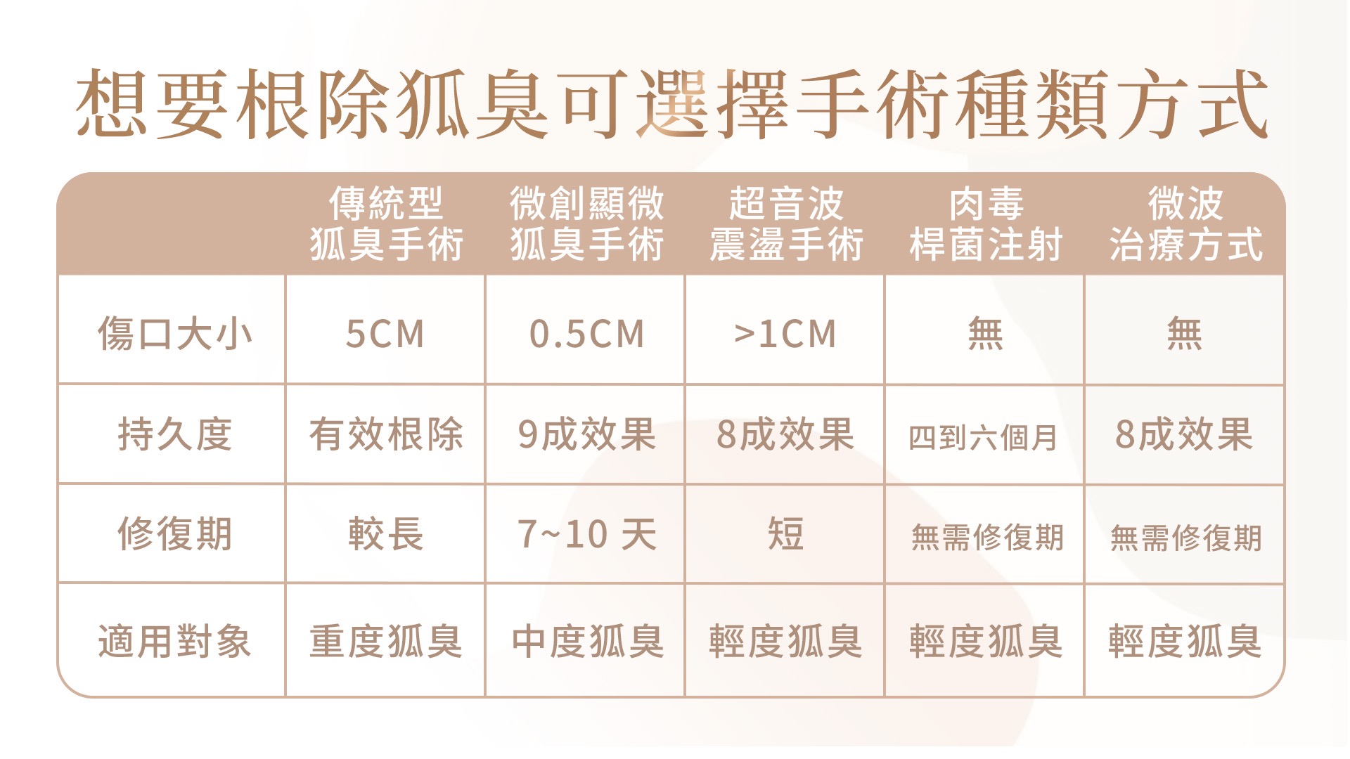 A:狐臭手術可以長期改善腋下的臭味問題,但因為人體的生理機能和狐臭的成因多種多樣,手術僅針對腋下的汗腺或細菌進行處理,無法改變其他因素而導致的體味問題。