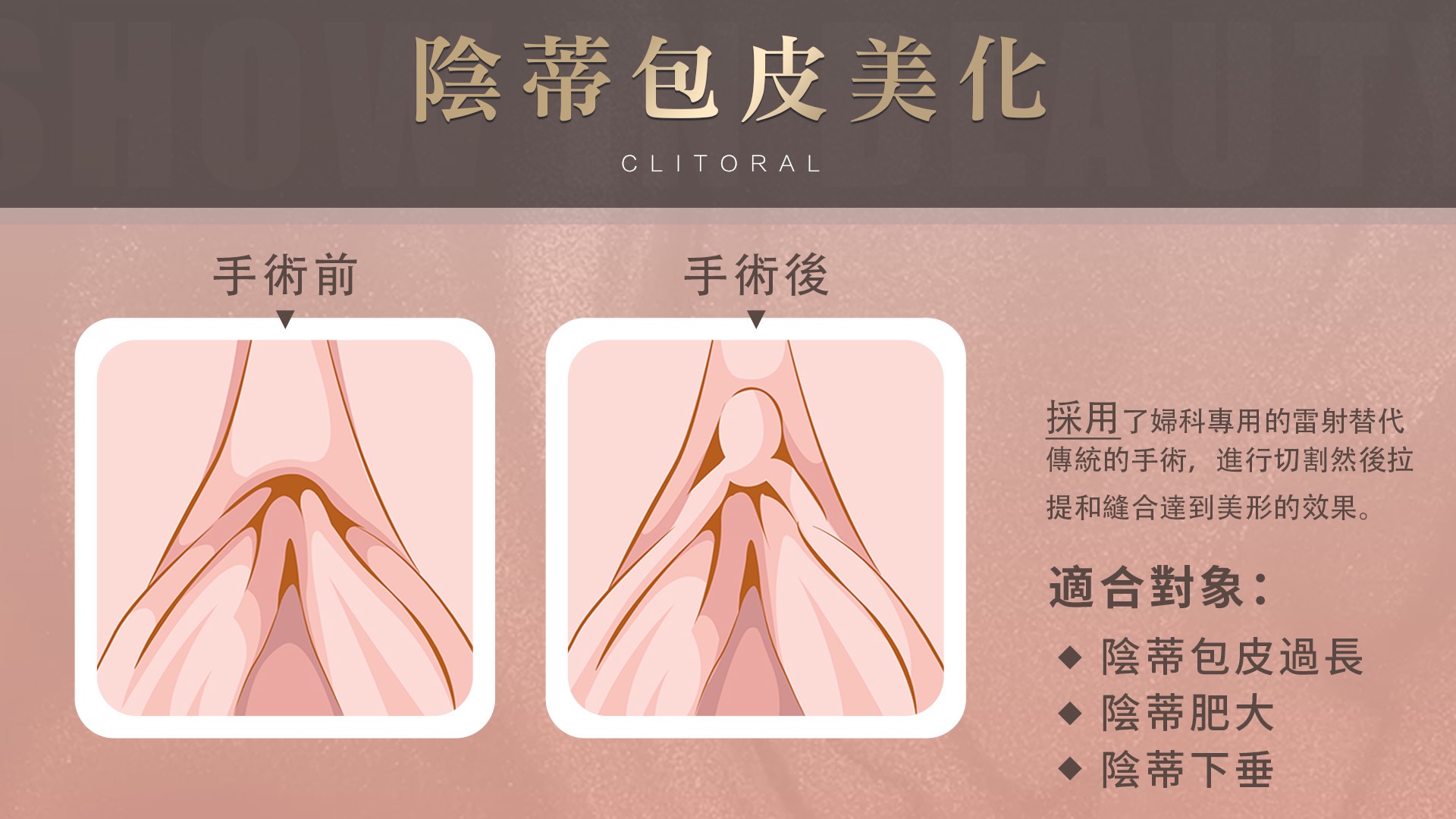 女性在性愉悅的過程陰道高潮固然重要,但陰蒂高潮也要顧到陰蒂是極為敏感的區域,當陰蒂包皮過長或下垂時,可能會導致陰蒂難以受到刺激,影響性愛的滿足度,進而影響性生活品質,此外,過長的陰蒂包皮也可能難以清潔而引起感染問題,為應對陰蒂包皮過長的情況,現代的陰蒂包皮美形術採用了婦科專用的雷射替代傳統的手術,手術會先進行切割然後拉提和縫合達到美形的效果。