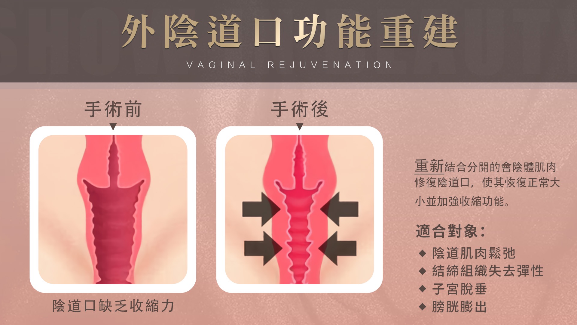 女性在分娩過程中會陰部可能因為切開或自然裂開,產程過後因癒合不良可能導致大陰道口的形成,這種情況在性行為時可能會引入空氣,造成類似放屁的噗噗聲,不僅尷尬也可能因為陰道口缺乏收縮力而影響性生活的愉悅,這可能是因為性行為帶來的新現象,或者是因為不斷改變體位而引起的,因應這樣的問題外陰道口的功能重建,手術是一種有效的解決方法,這種手術會重新結合分開的會陰體肌肉,修復陰道口,使其恢復正常大小並加強收縮功能。