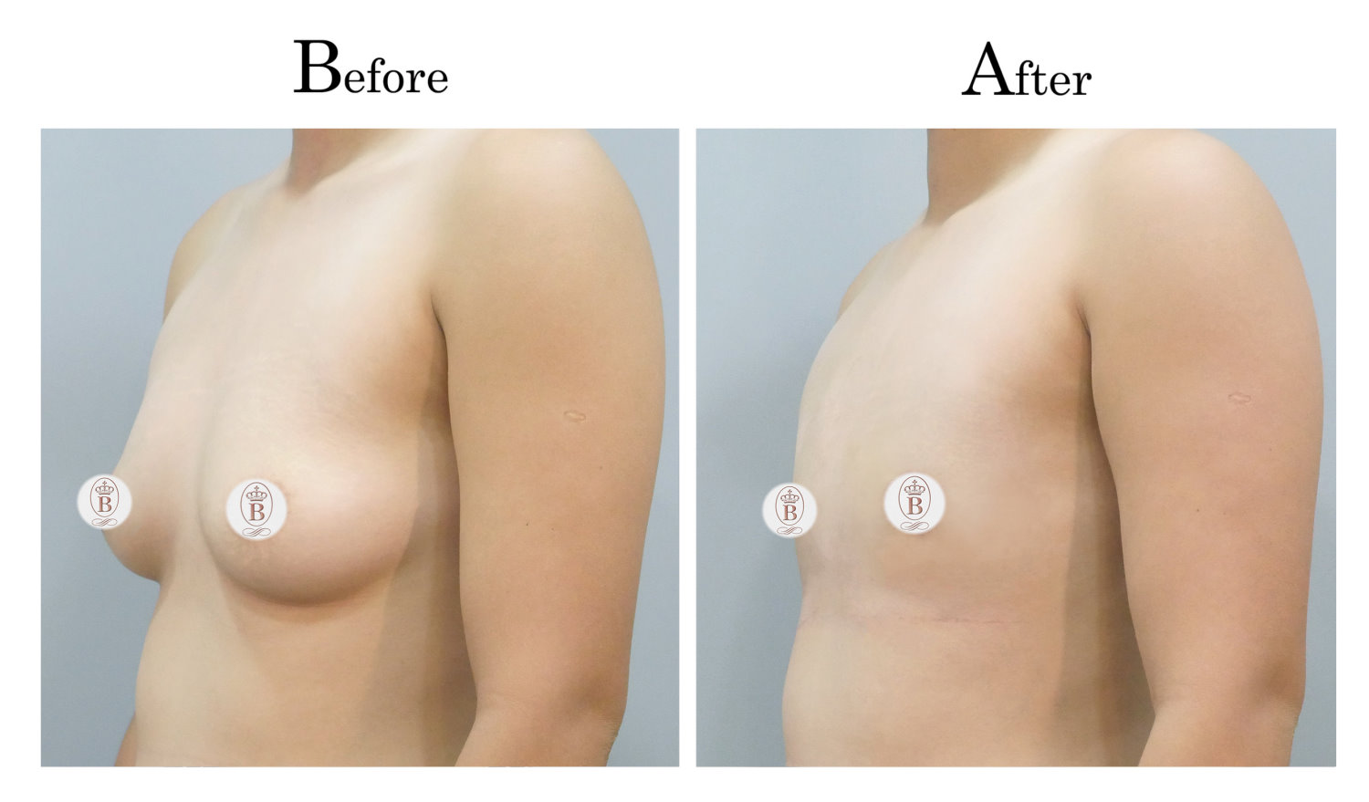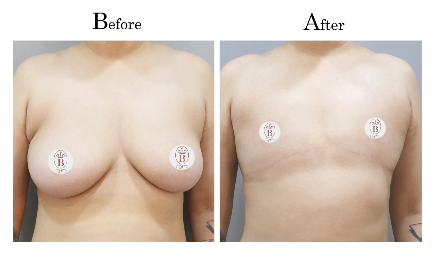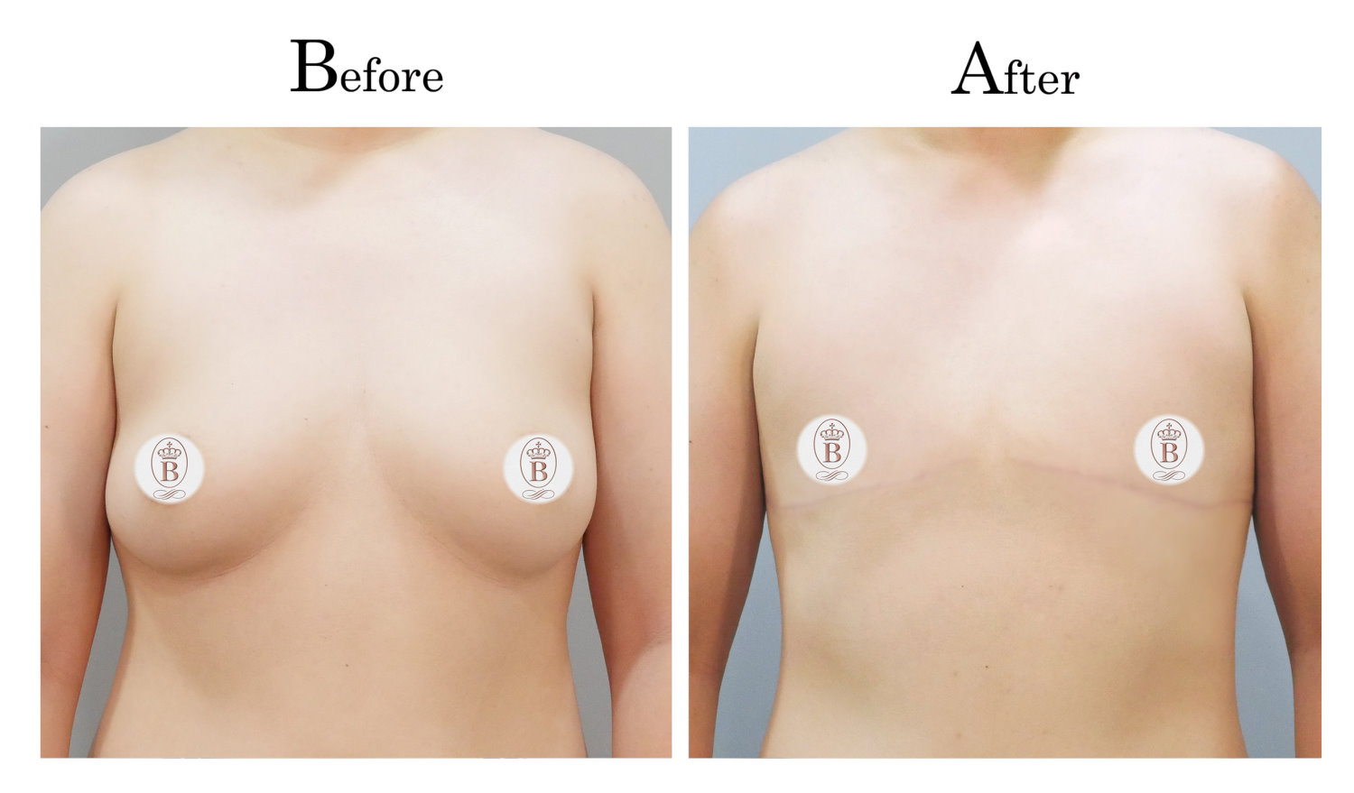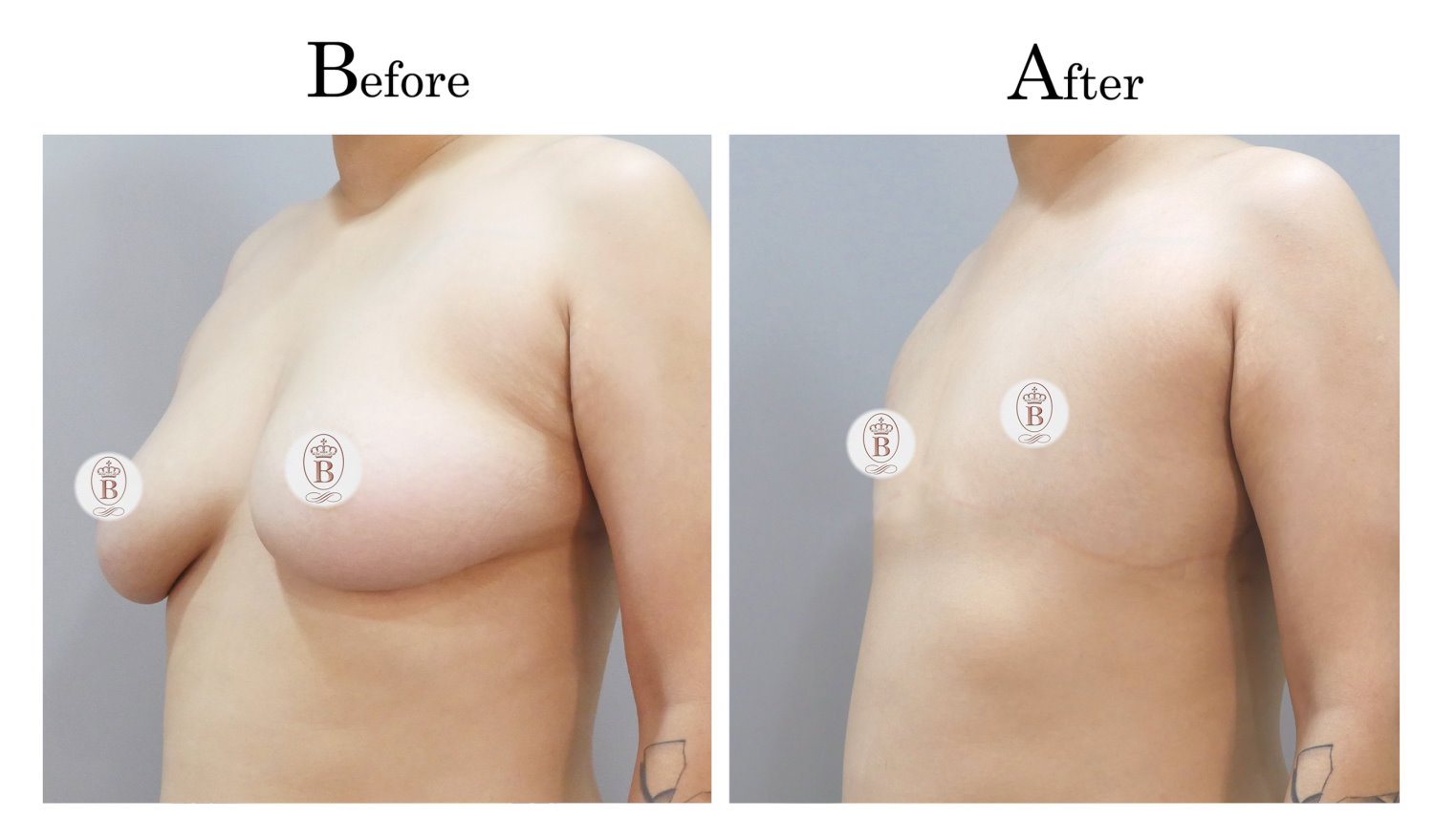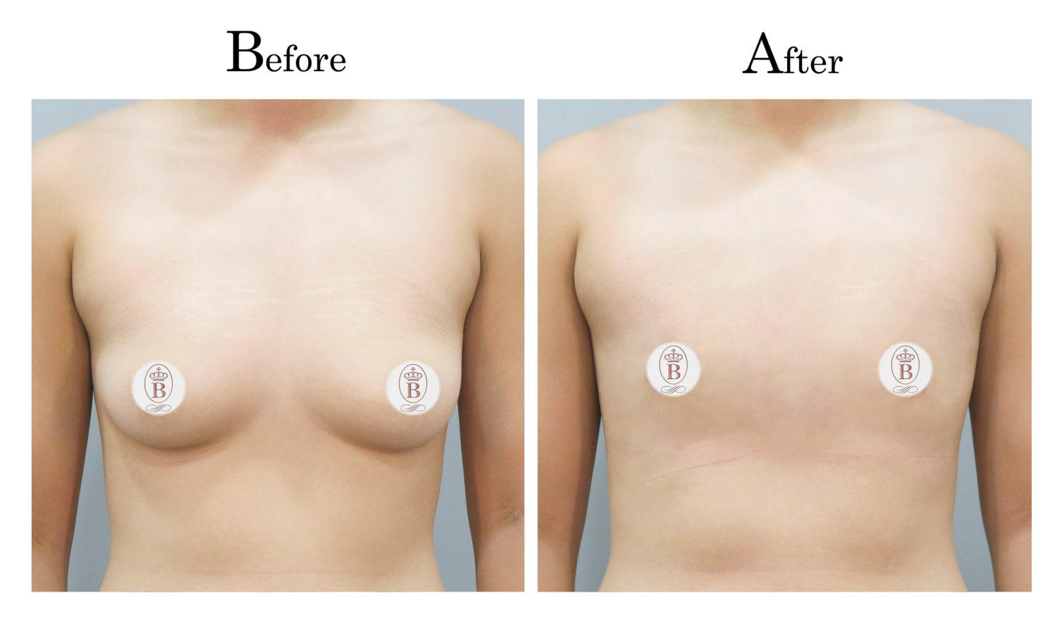 適用於術前罩杯落在B至C罩杯的患者,手術過程中會將乳房內的脂肪與乳線組織完全切除,同時切除乳暈周圍多餘的皮膚進行縫合,平胸手術的疤痕巧妙地隱藏在乳暈周圍,隨著時間逐漸淡化成細小的白色線條。