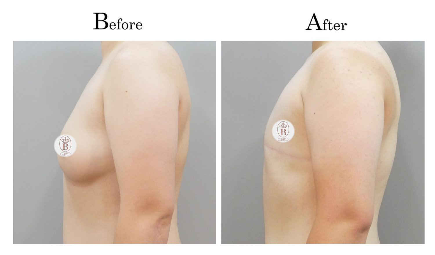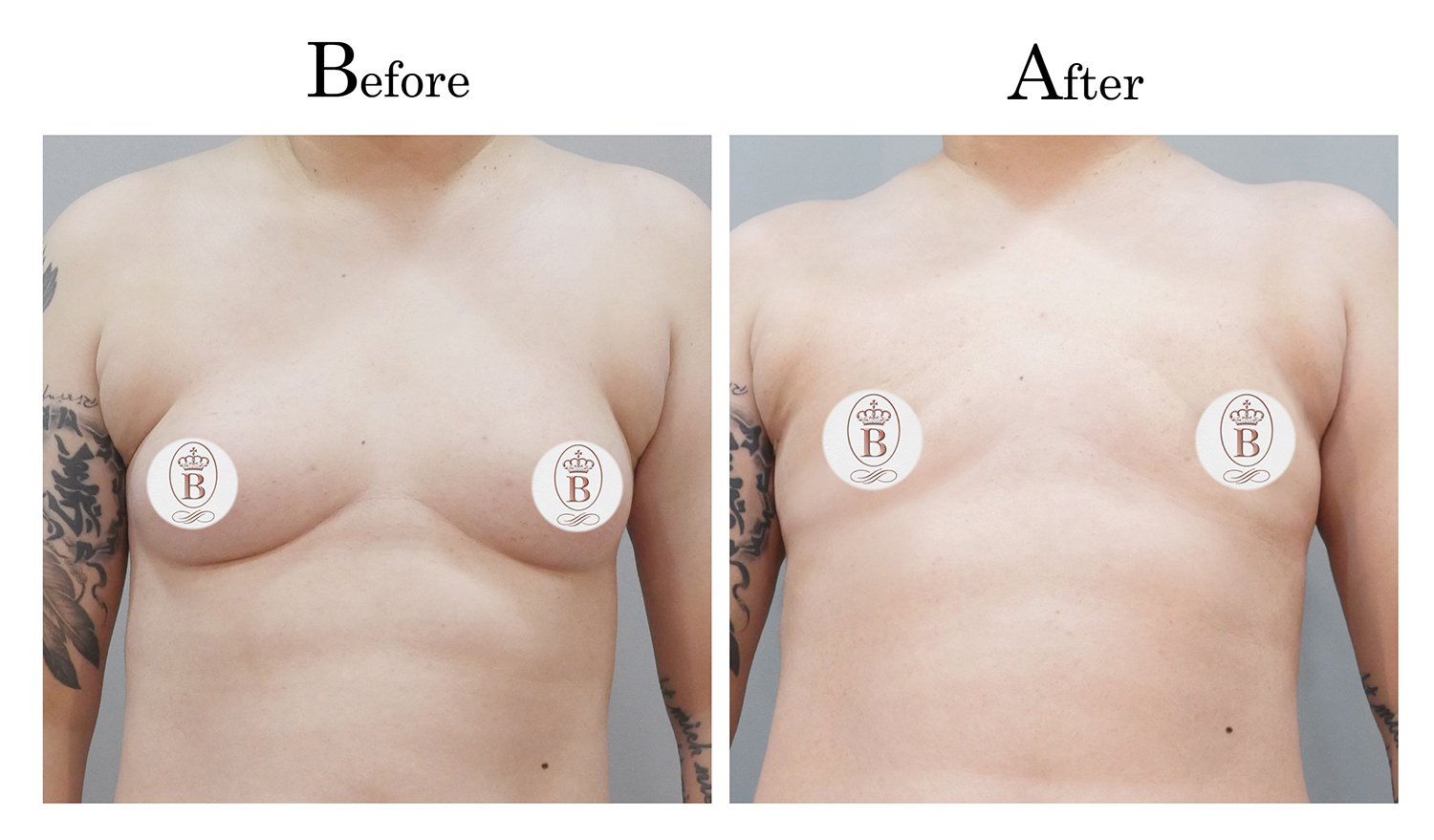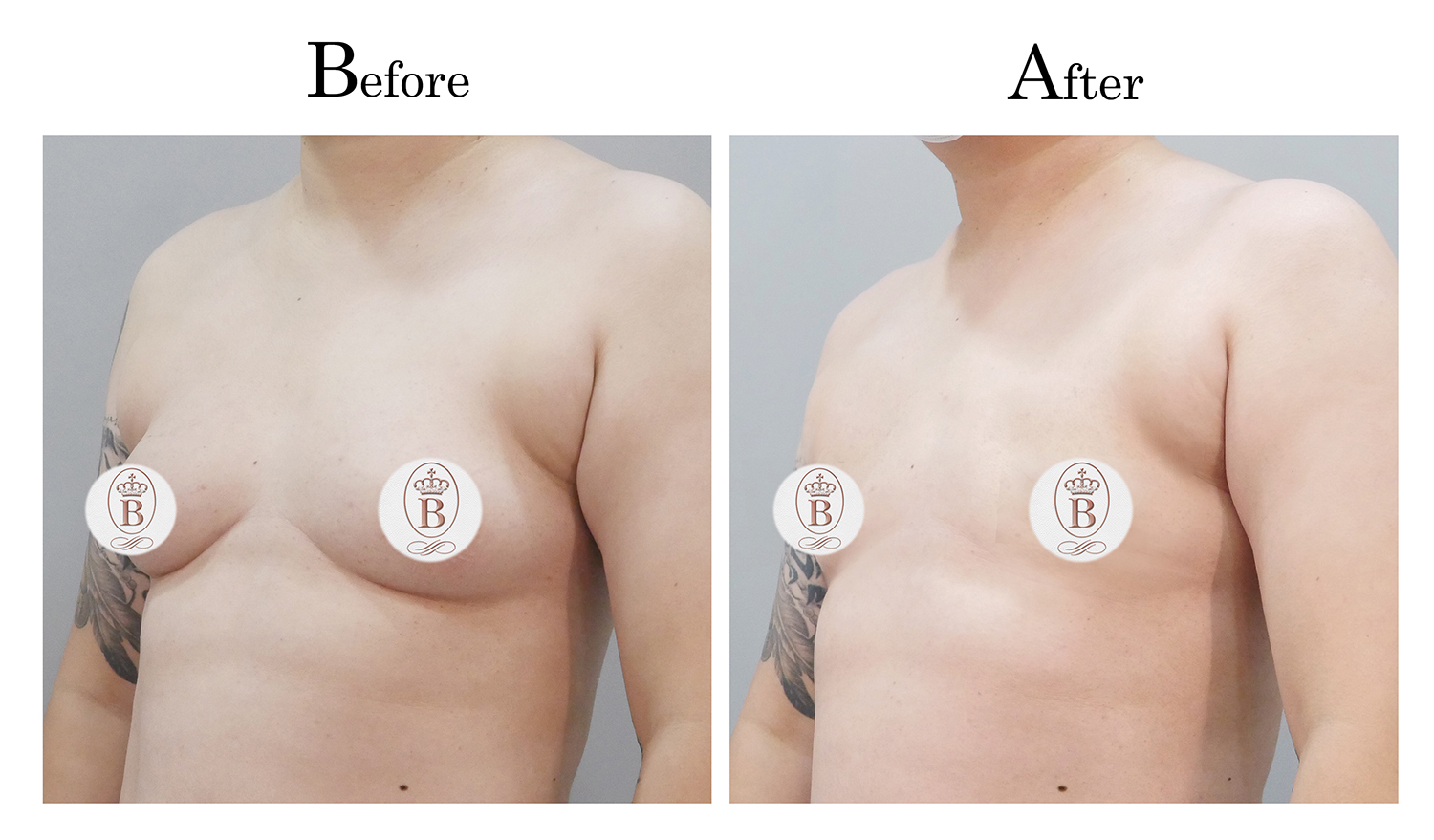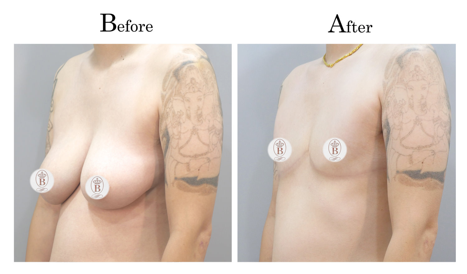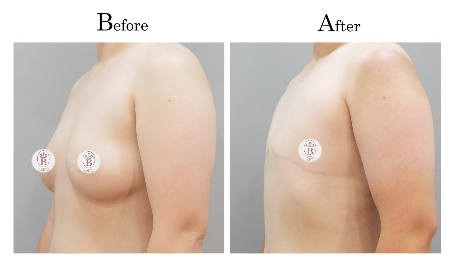 適用於術前罩杯落在B至C罩杯的患者,手術過程中會將乳房內的脂肪與乳線組織完全切除,同時切除乳暈周圍多餘的皮膚進行縫合,平胸手術的疤痕巧妙地隱藏在乳暈周圍,隨著時間逐漸淡化成細小的白色線條。