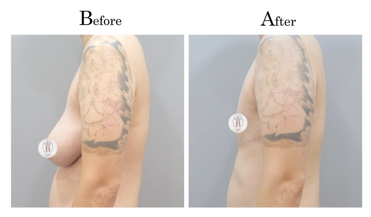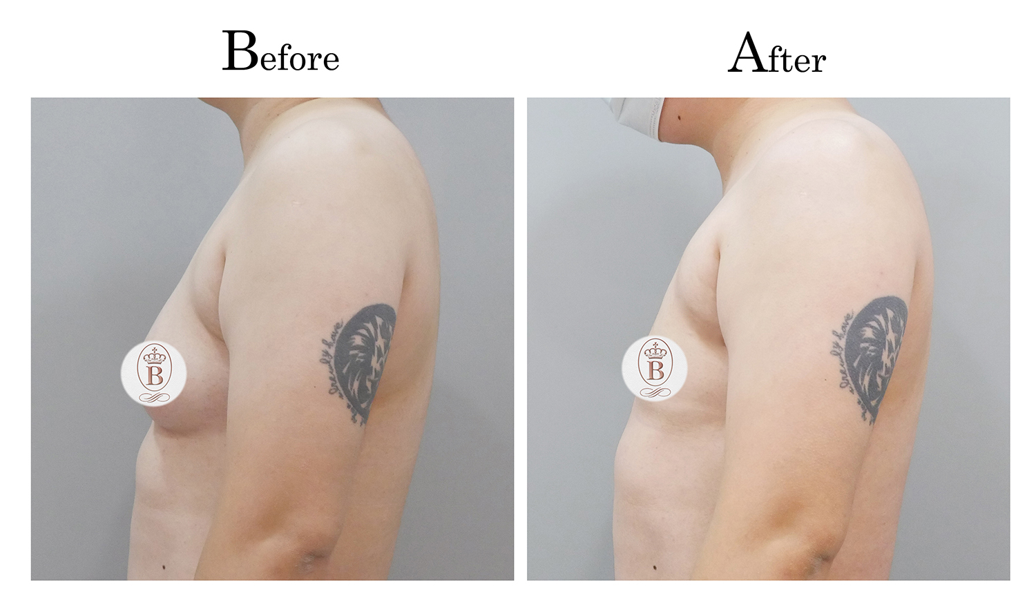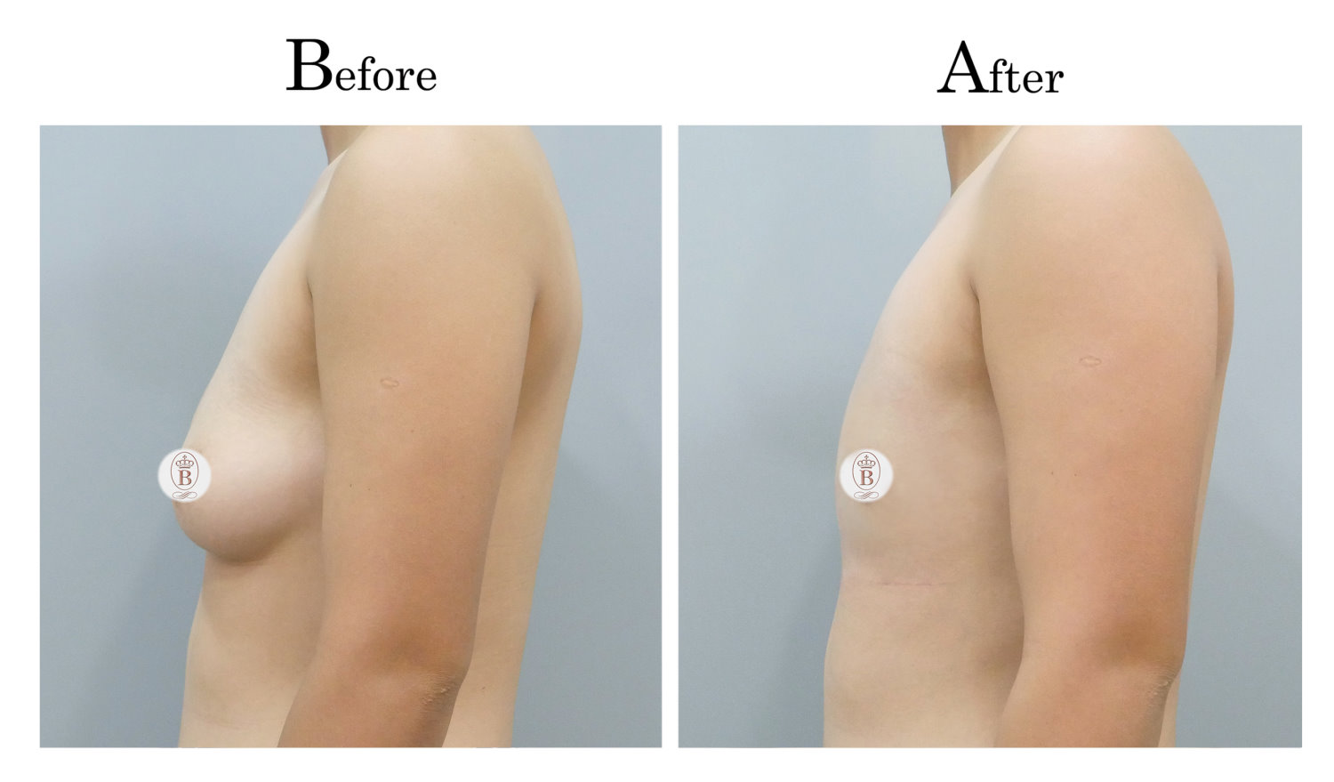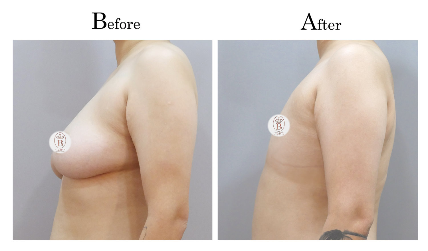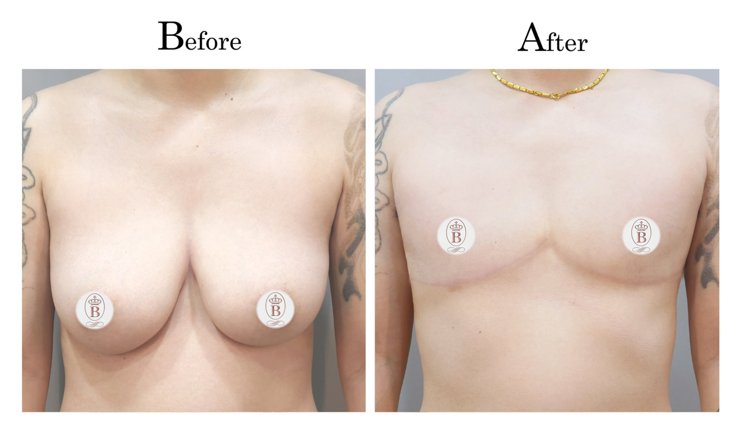 適用於術前罩杯落在B至C罩杯的患者,手術過程中會將乳房內的脂肪與乳線組織完全切除,同時切除乳暈周圍多餘的皮膚進行縫合,平胸手術的疤痕巧妙地隱藏在乳暈周圍,隨著時間逐漸淡化成細小的白色線條。