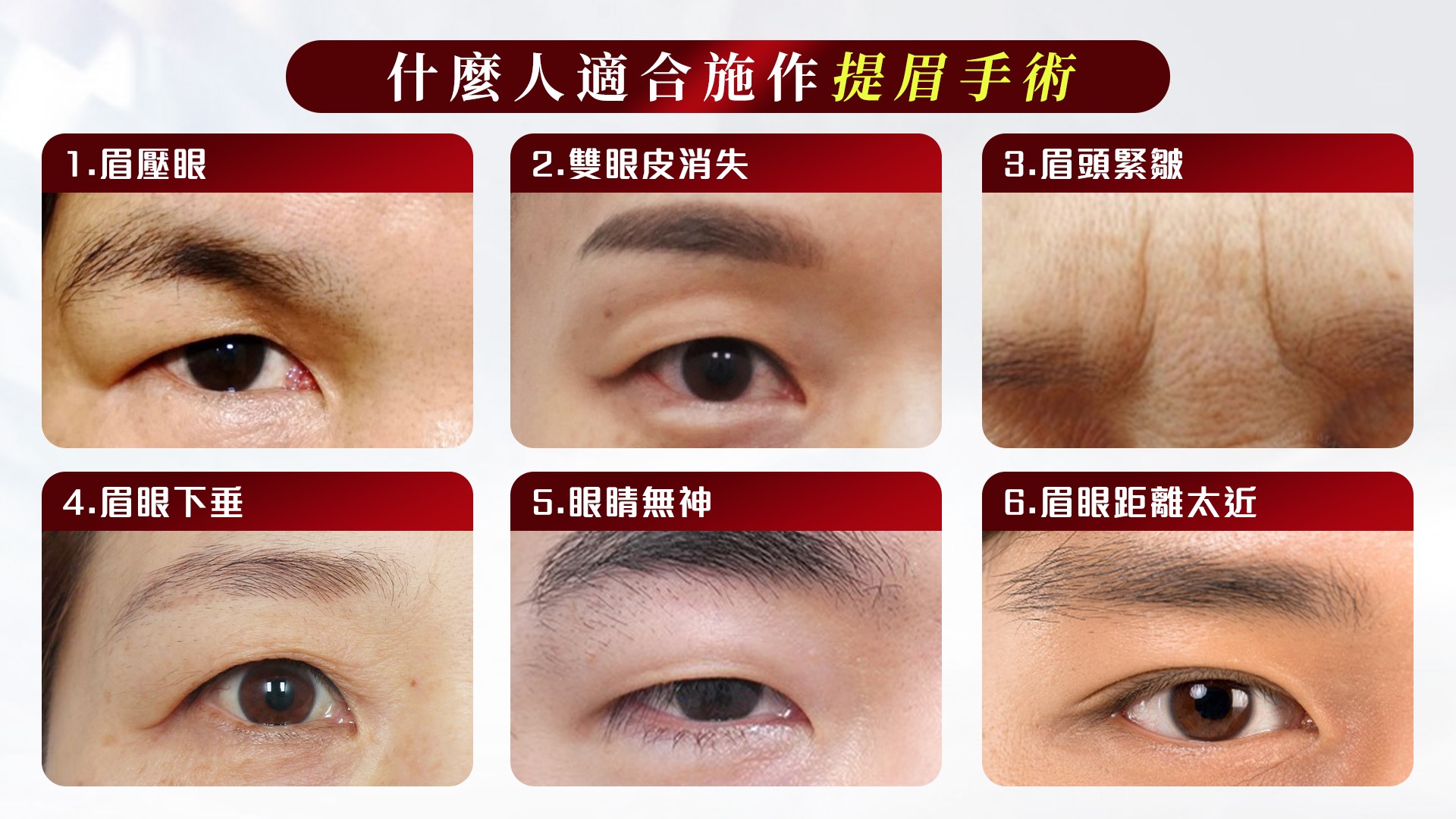 對於三十歲以下的人,內視鏡提眉手術適用於改善初老現象,例如眼皮小垂、雙眼皮下垂造成眉壓眼、眼神不善等問題,而三十歲以上的人常見的問題包含有眉眼鬆弛下垂,額頭凹陷以及眼神顯老等等的情況,內視鏡提眉手術能夠提供卓越的上臉部拉提與緊緻效果,可以使眼周恢復到神采奕奕。