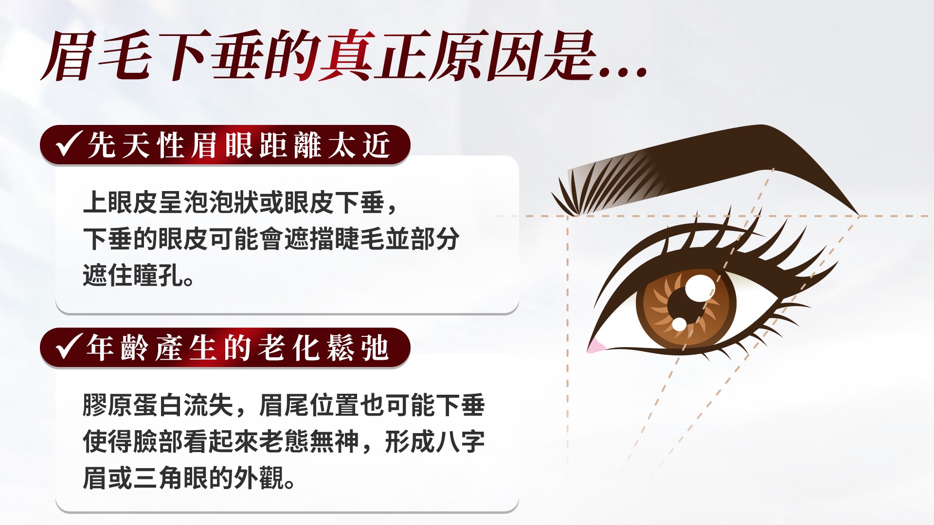 年齡增長膠原蛋白流失無可避免,這導致臉部皮膚失去彈性出現皺紋,同時眉尾位置也可能下垂,會形成八字眉或三角眼的外觀,使得臉部看起來老態無神,儘管有些人認為雙眼皮手術就能解決眼部外觀的所有問題,事實上,進行雙眼皮手術可能會留下眼皮的溝痕,雖然提升了眼神的明亮度,卻無法解決眉毛下垂的問題,使得整張臉的老態未得明顯改善。