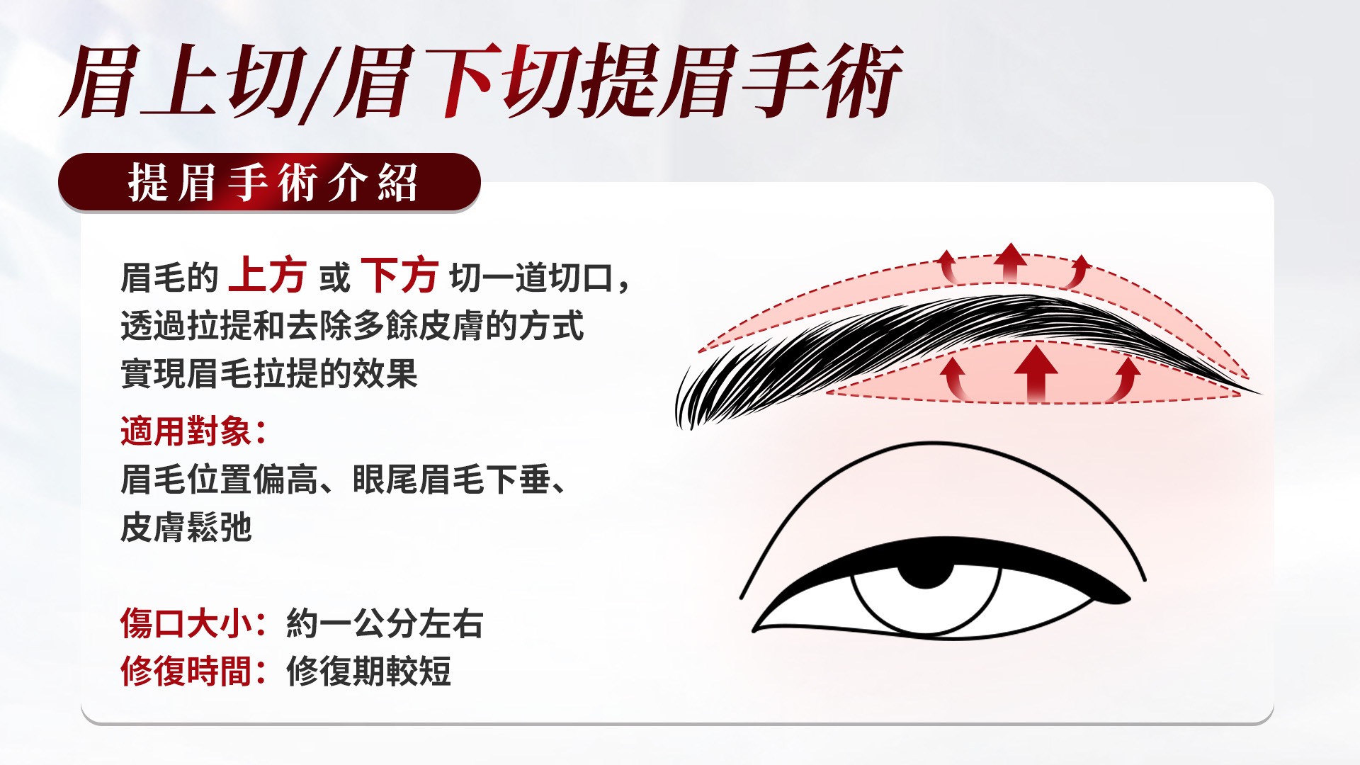 這種手術又被稱為眉毛上下緣手術,其原理是在眉毛的上方或下方切一道切口,切除多餘的皮膚,實現眉毛拉提的效果,這種手術簡單快速且術後消腫時間相對較短。透過拉提和去除多餘皮膚的方式,可使眉部迅速拉提消除臉部沉重感,讓面容變得更有朝氣。