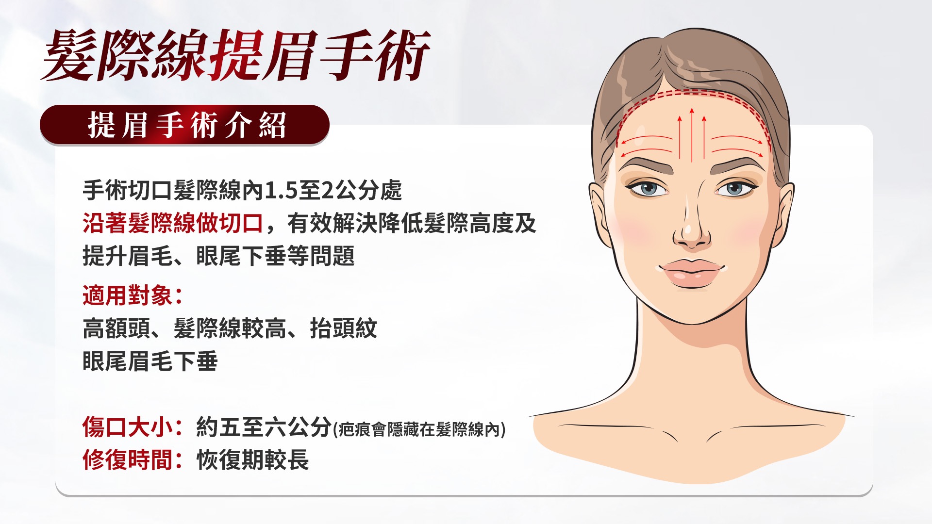 想要改善眼皮問題與眼角下移,希望提高眉尾同時改善高額頭的人,可以考慮髮際線提眉手術,手術切口通常選擇在髮際線內1.5至2公分處,對於那些額頭寬度與髮際線也較高的人,可以選擇將此方式切口會在髮際線前,有效降低髮際高度手術原理主要是剝離造成眼尾下垂的軔帶,並往後上方拉提皮膚並切除多餘的部分。