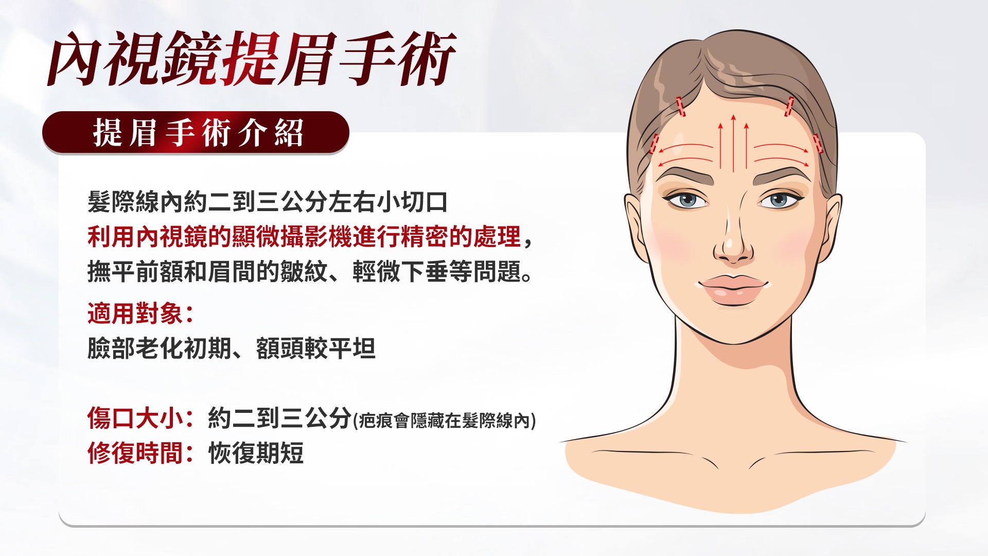 手術的主目的是為了撫平前額和眉間的皺紋,矯正外眼眥下垂改善眉型下垂提高眉毛的高度,這種手術特別適合年紀較輕,上臉部在進入老化初期、抬頭紋會較不明顯、額頭較平坦或不夠高的人,值得注意的是,對於額頭較高的患者,這種方法可能無法達到理想的效果,因此需要較精準的評估。