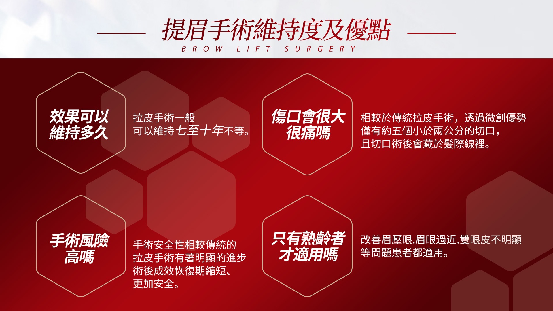 A : 內視鏡提眉手術能夠清楚觀察額頭肌肉組織,透過五爪固定的方式進行精確調整,使兩側的眉型達到對稱。