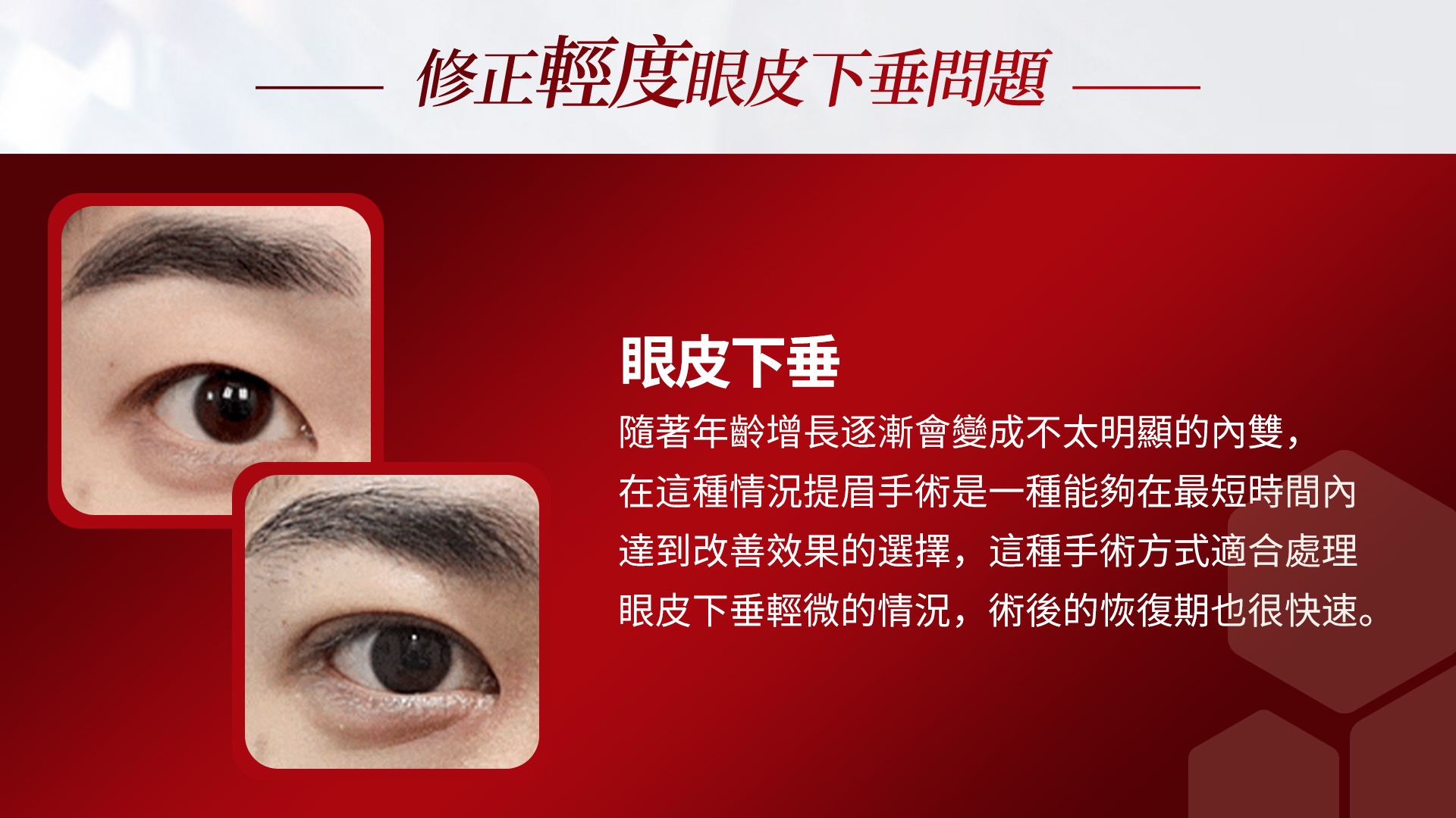 年輕時原本擁有漂亮的雙眼皮,但隨著年齡增長逐漸會變成不太明顯的內雙,在這種情況提眉手術是一種能夠在最短時間內達到改善效果的選擇,這種手術方式適合處理眼皮下垂輕微的情況,術後的恢復期也很快速。