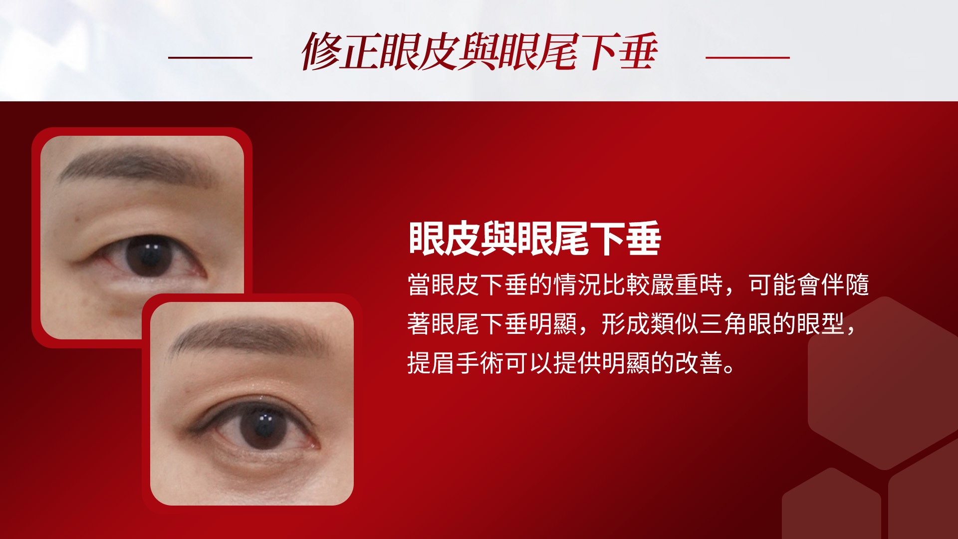 當眼皮下垂的情況比較嚴重時,可能會伴隨著眼尾下垂明顯,形成類似三角眼的眼型,給人一種沒精神的感覺,提眉手術可以提供明顯的改善,因為它能夠改善眼尾下垂的問題,使眼型更加明亮有神,與雙眼皮手術相比割雙眼皮的方式對於眼尾下垂的處理效果並不明顯,無法達到患者期望的改善效果,眼尾下垂明顯的患者,提眉手術是一個更好的選擇。
