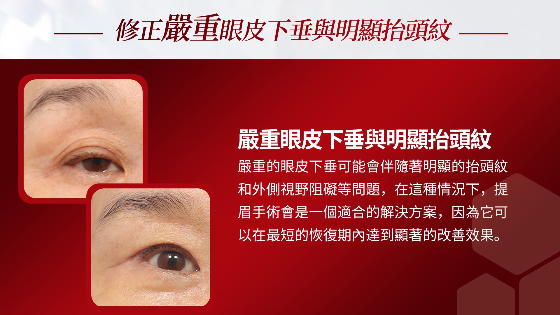 嚴重的眼皮下垂可能會伴隨著明顯的抬頭紋和外側視野阻礙等問題,這情況會使眼睛容易感到疲勞,在這種情況下,提眉手術會是一個適合的解決方案,因為它可以在最短的恢復期內達到顯著的改善效果,額頭拉皮手術也是適用於嚴重眼皮下垂的方法之一,但需要進行全身麻醉且手術的恢復期相對較長。