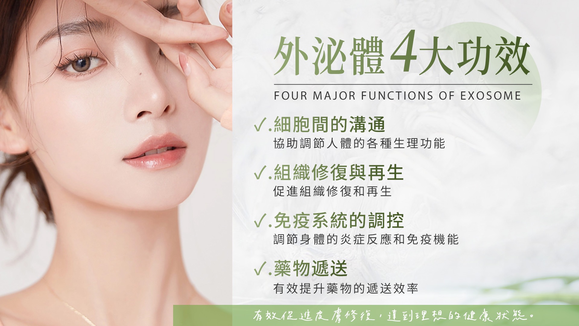 保養品中含有約80至300億顆外泌體,具備抗氧化、抗過敏和抗老化的特性,能有效提升皮膚中的膠原蛋白和彈性蛋白含量。根據人體試驗結果,使用者的皮膚彈性和水分含量可提升10%至30%,而皺紋、毛孔大小和皮膚發炎的程度則降低了約10%至近60%。